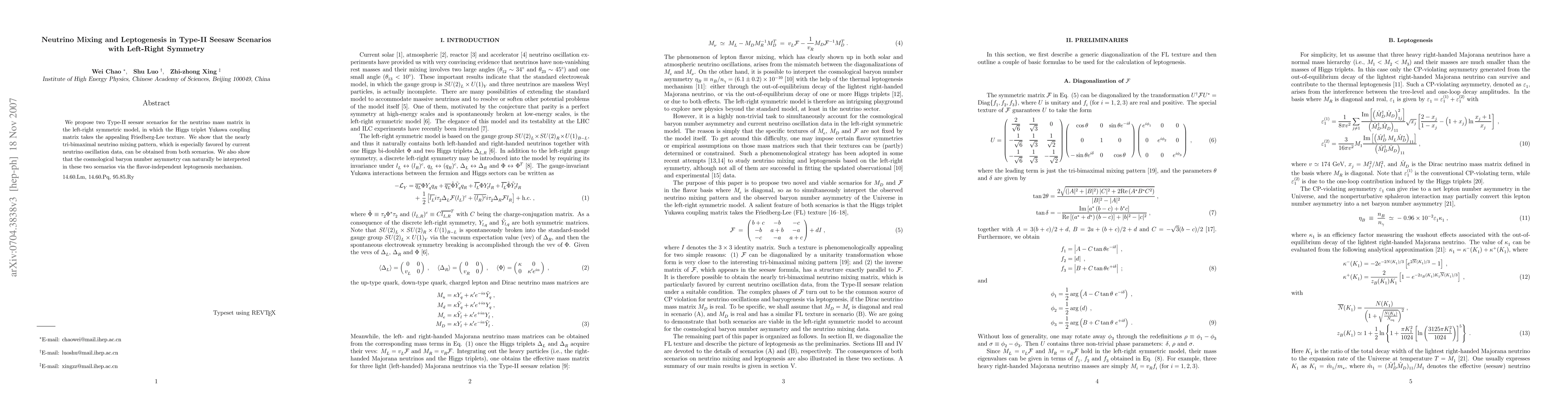 This paper proposes two Type-II seesaw scenarios within a left-right symmetric model, demonstrating that they can yield a nearly tri-bimaximal neutrino mixing pattern favored by current oscillation data. It also shows that these scenarios can naturally explain the cosmological baryon asymmetry through a flavor-independent leptogenesis mechanism.