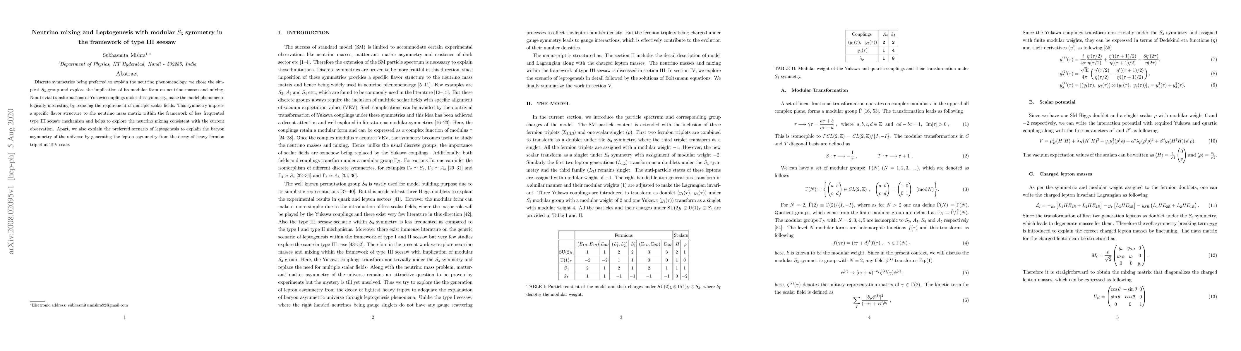 Discrete symmetries being preferred to explain the neutrino phenomenology, we chose the simplest $S_3$ group and explore the implication of its modular form on neutrino masses and mixing. Non-trivial transformations of Yukawa couplings under this symmetry, make the model phenomenologically interesting by reducing the requirement of multiple scalar fields. This symmetry imposes a specific flavor structure to the neutrino mass matrix within the framework of less frequented type III seesaw mechanism and helps to explore the neutrino mixing consistent with the current observation. Apart, we also explain the preferred scenario of leptogenesis to explain the baryon asymmetry of the universe by generating the lepton asymmetry from the decay of heavy fermion triplet at TeV scale.