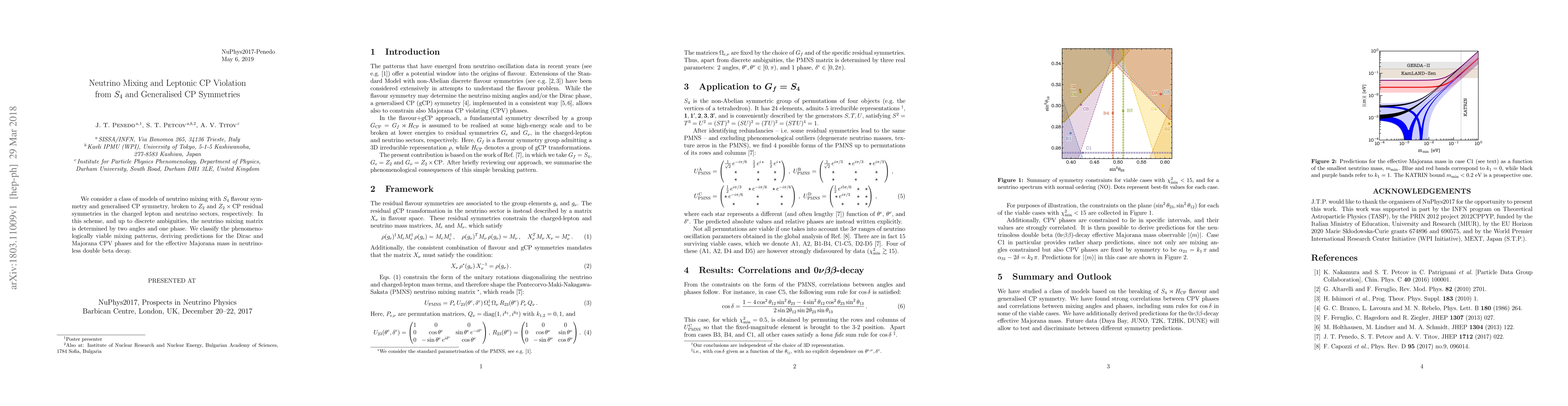 We consider a class of models of neutrino mixing with $S_4$ flavour symmetry and generalised CP symmetry, broken to $Z_2$ and $Z_2 \times {\rm CP}$ residual symmetries in the charged lepton and neutrino sectors, respectively. In this scheme, and up to discrete ambiguities, the neutrino mixing matrix is determined by two angles and one phase. We classify the phenomenologically viable mixing patterns, deriving predictions for the Dirac and Majorana CPV phases and for the effective Majorana mass in neutrinoless double beta decay.