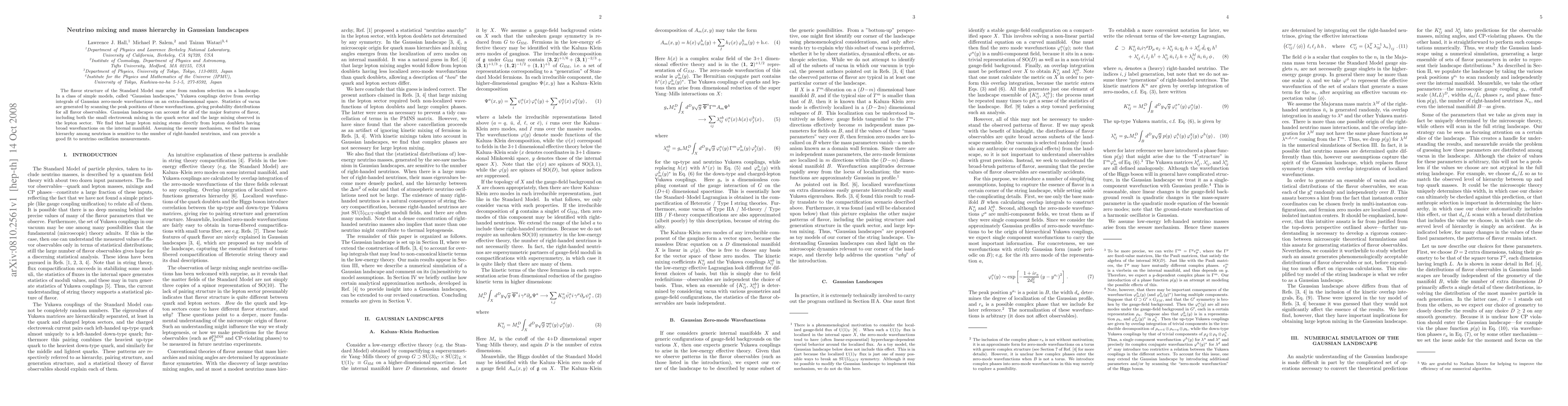 This paper explores how neutrino mixing and mass hierarchy can emerge from Gaussian landscapes, where Yukawa couplings are determined by Gaussian zero-mode wavefunctions in extra-dimensional spaces. It finds that large lepton mixing results from broad wavefunctions and that the mass hierarchy depends on the number of right-handed neutrinos, fitting well with neutrino oscillation data.
