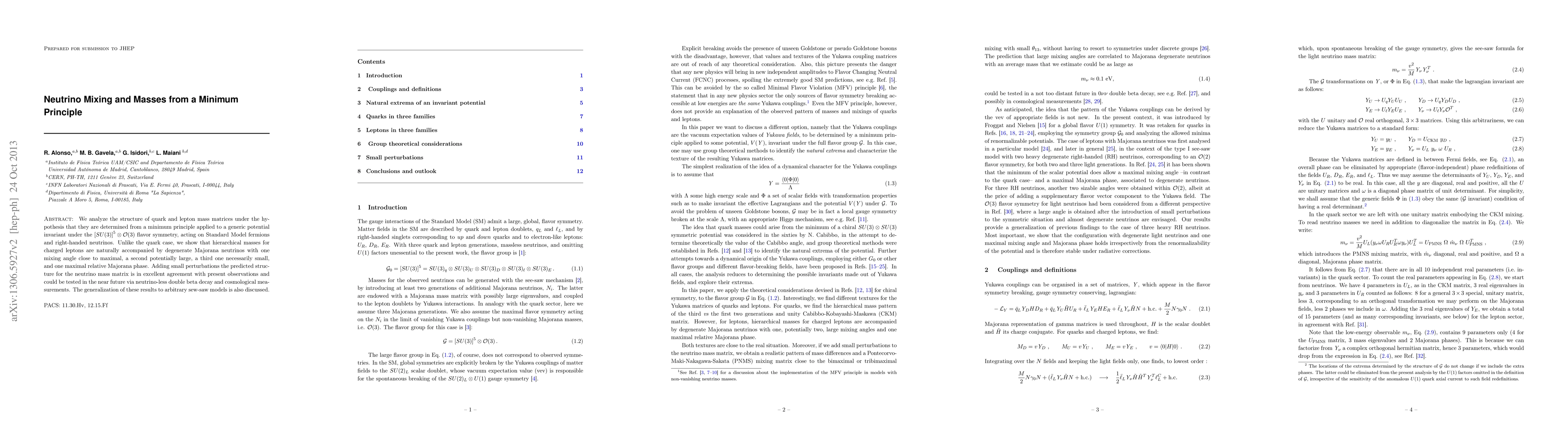 We analyze the structure of quark and lepton mass matrices under the hypothesis that they are determined from a minimum principle applied to a generic potential invariant under the $\left[SU(3)\right]^5\otimes \mathcal O(3)$ flavor symmetry, acting on Standard Model fermions and right-handed neutrinos. Unlike the quark case, we show that hierarchical masses for charged leptons are naturally accompanied by degenerate Majorana neutrinos with one mixing angle close to maximal, a second potentially large, a third one necessarily small, and one maximal relative Majorana phase. Adding small perturbations the predicted structure for the neutrino mass matrix is in excellent agreement with present observations and could be tested in the near future via neutrino-less double beta decay and cosmological measurements. The generalization of these results to arbitrary sew-saw models is also discussed.