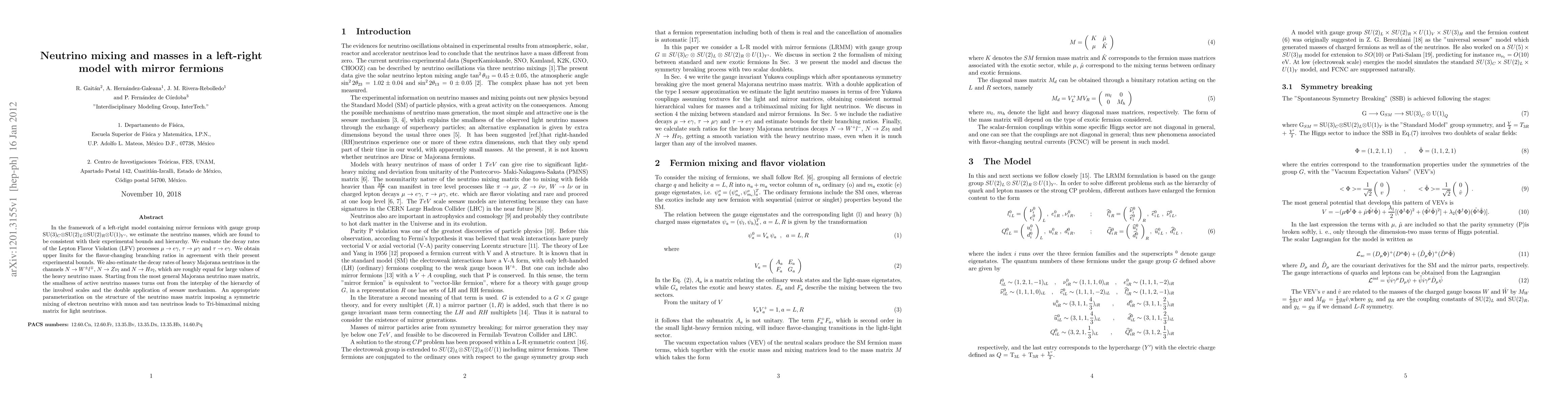 In the framework of a left-right model containing mirror fermions with gauge group SU(3)$_{C} \otimes SU(2)_{L} \otimes SU(2)_{R} \otimes U(1)_{Y^\prime}$, we estimate the neutrino masses, which are found to be consistent with their experimental bounds and hierarchy. We evaluate the decay rates of the Lepton Flavor Violation (LFV) processes $\mu \rightarrow e \gamma$, $\tau \rightarrow \mu \gamma$ and $\tau \rightarrow e\gamma$. We obtain upper limits for the flavor-changing branching ratios in agreement with their present experimental bounds. We also estimate the decay rates of heavy Majorana neutrinos in the channels $N \rightarrow W^{\pm} l^{\mp}$, $N \rightarrow Z \nu_{l}$ and $N \rightarrow H \nu_{l}$, which are roughly equal for large values of the heavy neutrino mass. Starting from the most general Majorana neutrino mass matrix, the smallness of active neutrino masses turns out from the interplay of the hierarchy of the involved scales and the double application of seesaw mechanism. An appropriate parameterization on the structure of the neutrino mass matrix imposing a symmetric mixing of electron neutrino with muon and tau neutrinos leads to Tri-bimaximal mixing matrix for light neutrinos.