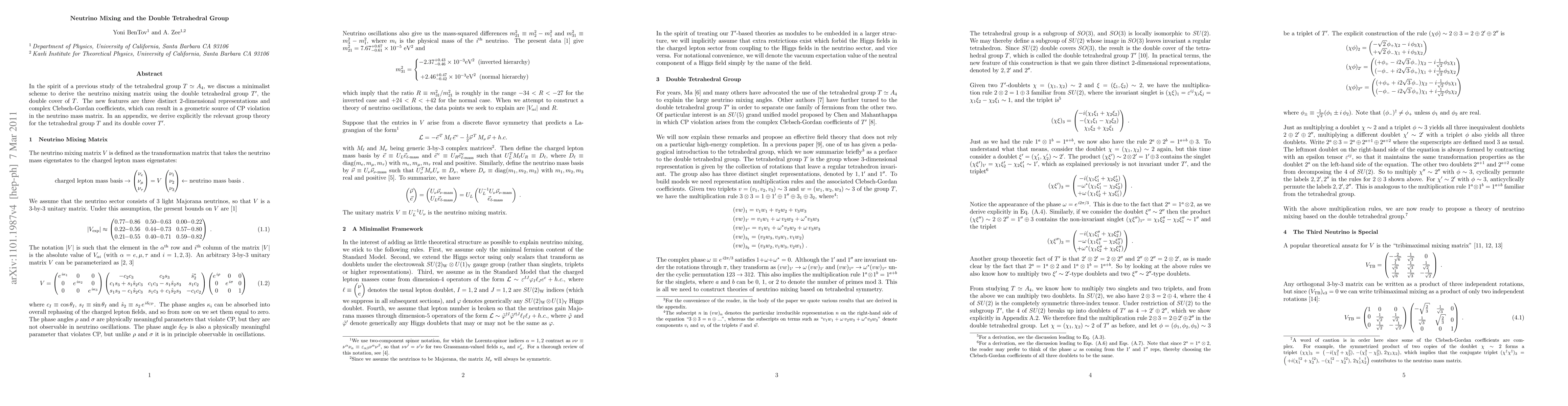 In the spirit of a previous study of the tetrahedral group $T \simeq A_4$, we discuss a minimalist scheme to derive the neutrino mixing matrix using the double tetrahedral group $T'$, the double cover of $T$. The new features are three distinct 2-dimensional representations and complex Clebsch-Gordan coefficients, which can result in a geometric source of CP violation in the neutrino mass matrix. In an appendix, we derive explicitly the relevant group theory for the tetrahedral group $T$ and its double cover $T'$.