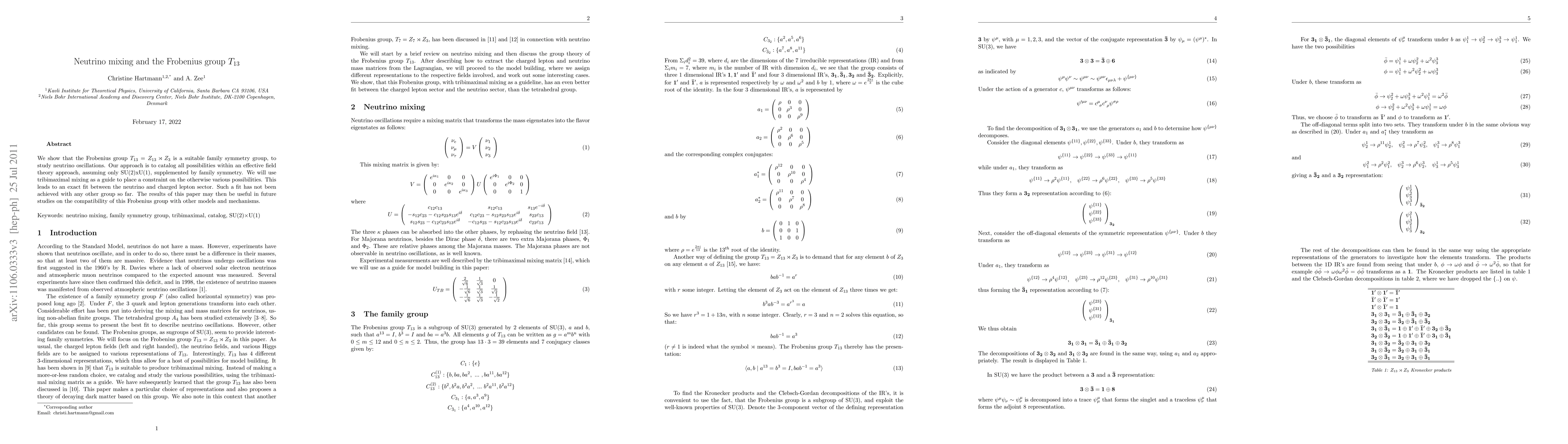 We show that the Frobenius group $T_{13} = Z_{13} \rtimes Z_3$ is a suitable family symmetry group to study neutrino oscillations. Our approach is to catalog all possibilities within an effective field theory approach, assuming only SU(2)xU(1) supplemented by family symmetry. We will use tribimaximal mixing as a guide to place a constraint on the otherwise various possibilities. This leads to an exact fit between the neutrino and charged lepton sector. Such a fit has not been achieved with any other group so far. The results of this paper may then be useful in future studies on the compatibility of this Frobenius group with other models and mechanisms.