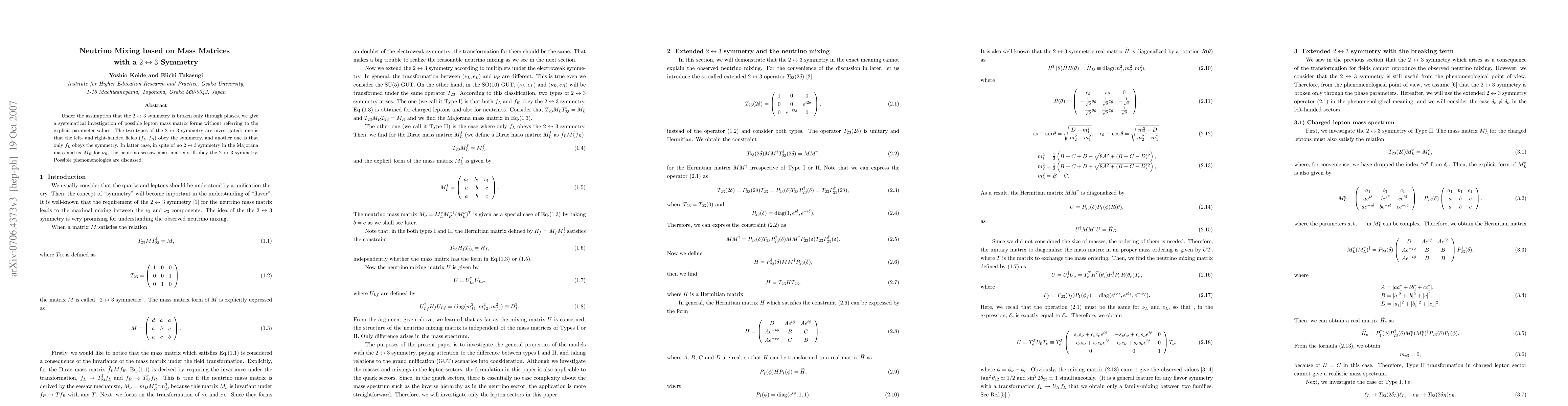 This paper investigates neutrino mixing based on mass matrices exhibiting $2\leftrightarrow 3$ symmetry, focusing on the symmetry's implications without specific parameter values. It explores two types of symmetry: one for both left- and right-handed fields, and another for left-handed fields only, where the Majorana mass matrix lacks symmetry but the seesaw mass matrix retains it.