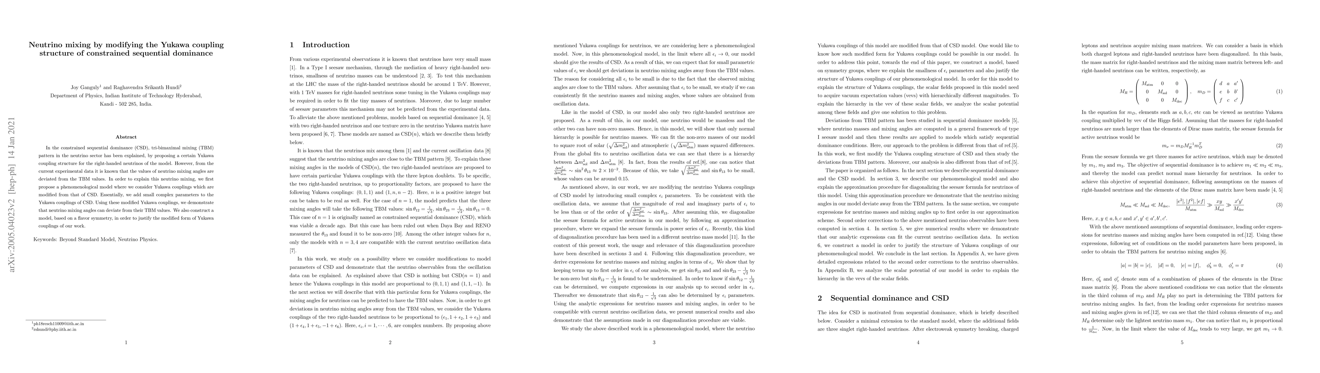 This paper proposes a modified Yukawa coupling structure within constrained sequential dominance to explain deviations in neutrino mixing angles from the tri-bimaximal mixing pattern. It introduces small complex parameters to the original Yukawa couplings and constructs a flavor symmetry model to justify the changes.