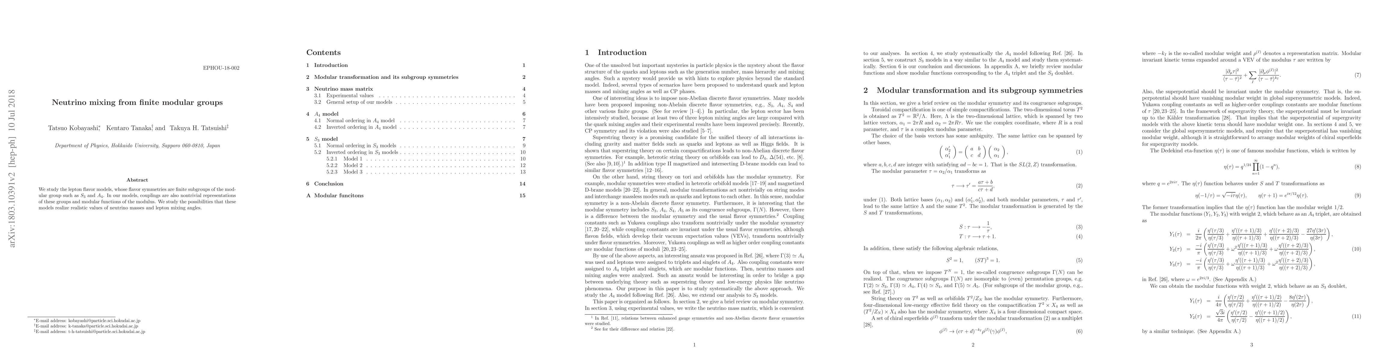 We study the lepton flavor models, whose flavor symmetries are finite subgroups of the modular group such as $S_3$ and $A_4$. In our models, couplings are also nontrivial representations of these groups and modular functions of the modulus. We study the possibilities that these models realize realistic values of neutrino masses and lepton mixing angles.