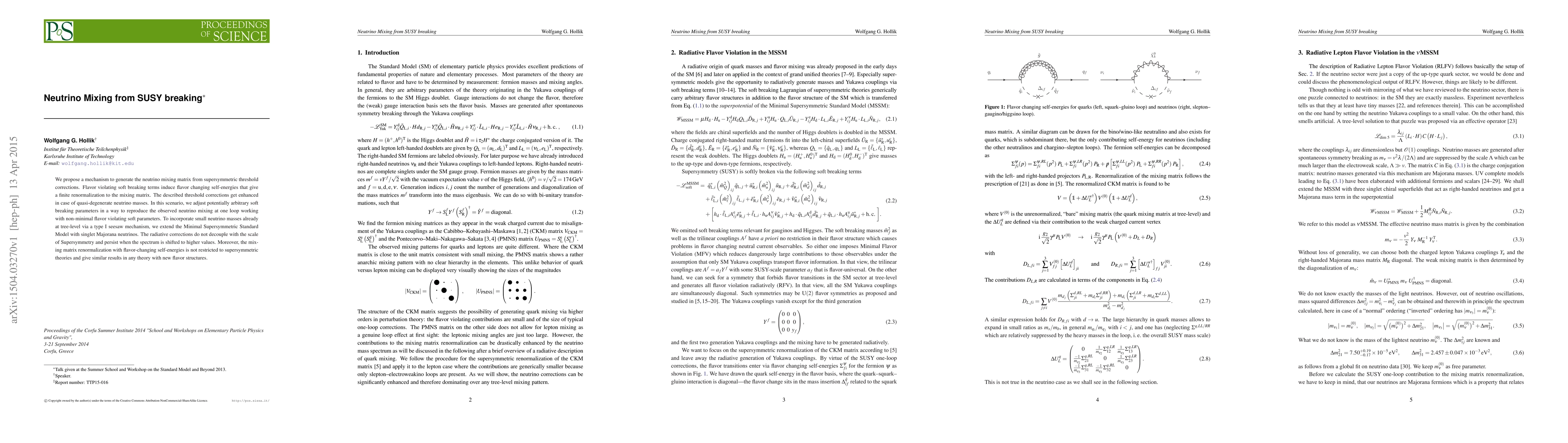 This paper proposes a mechanism for generating the neutrino mixing matrix through supersymmetric threshold corrections, utilizing flavor-changing soft breaking terms. It extends the Minimal Supersymmetric Standard Model with singlet Majorana neutrinos to incorporate small neutrino masses at tree-level via a type I seesaw mechanism, while radiative corrections persist even at higher SUSY scales.