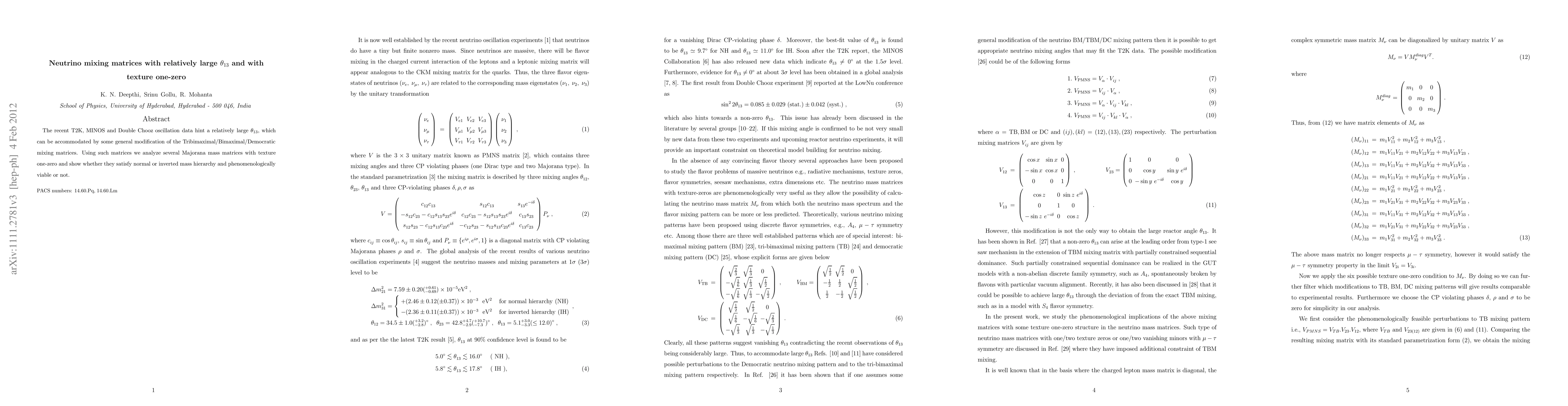 This paper explores neutrino mixing matrices that accommodate a relatively large $\theta_{13}$ angle, analyzing texture one-zero Majorana mass matrices to determine their compatibility with normal or inverted mass hierarchies and their phenomenological viability.