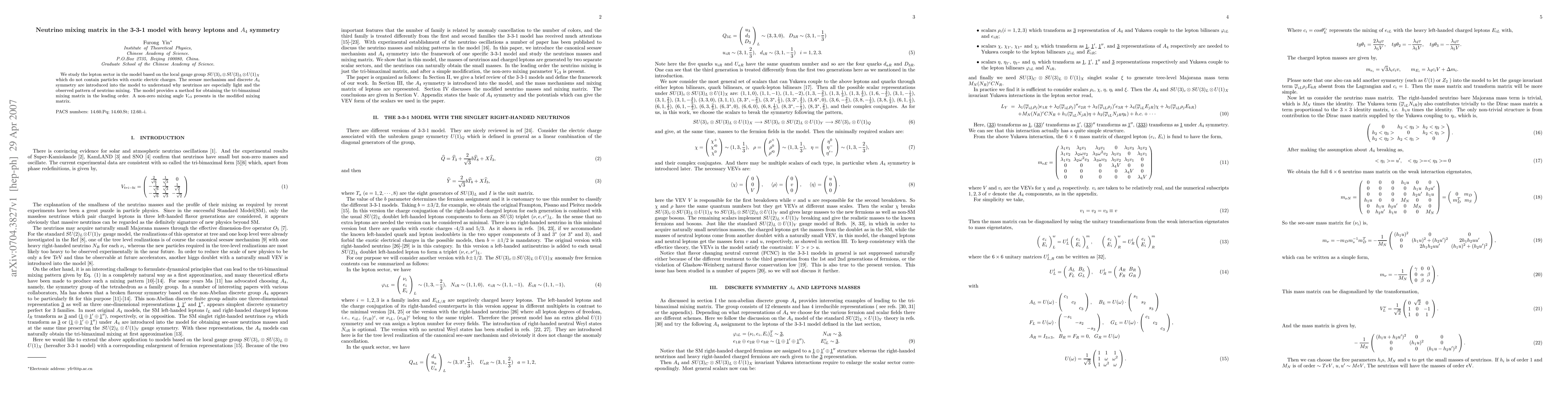 We study the lepton sector in the model based on the local gauge group $SU(3)_c\otimes SU(3)_L\otimes U(1)_X$ which do not contain particles with exotic electric charges. The seesaw mechanism and discrete $A_4$ symmetry are introduced into the model to understand why neutrinos are especially light and the observed pattern of neutrino mixing. The model provides a method for obtaining the tri-bimaximal mixing matrix in the leading order. A non-zero mixing angle $V_{e3}$ presents in the modified mixing matrix.