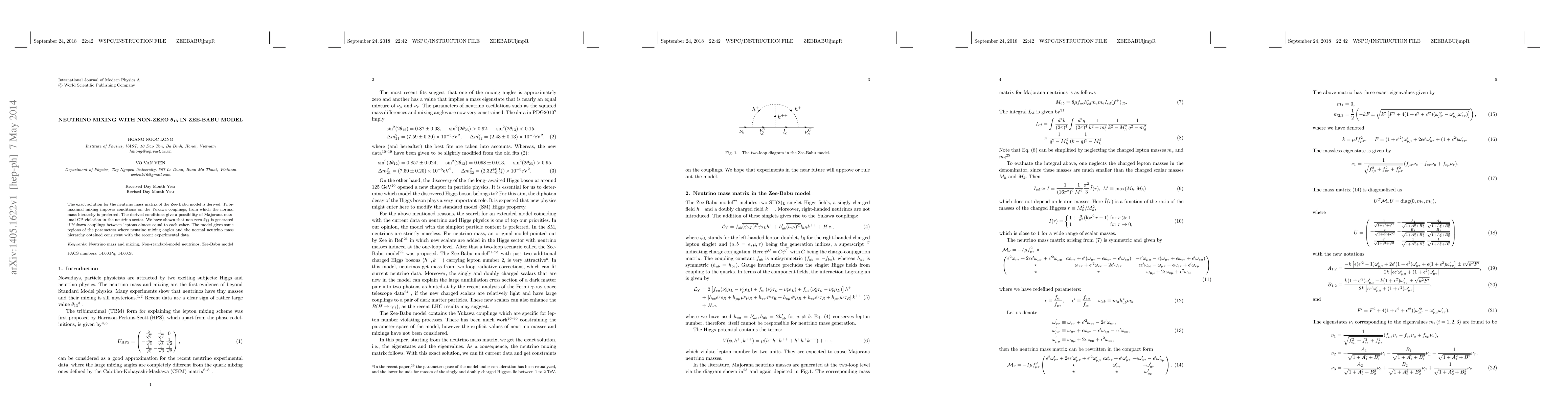 This paper derives the exact neutrino mass matrix for the Zee-Babu model, showing that tribimaximal mixing favors the normal mass hierarchy. It demonstrates that non-zero $\theta_{13}$ arises when lepton Yukawa couplings are nearly equal, aligning with recent experimental data.