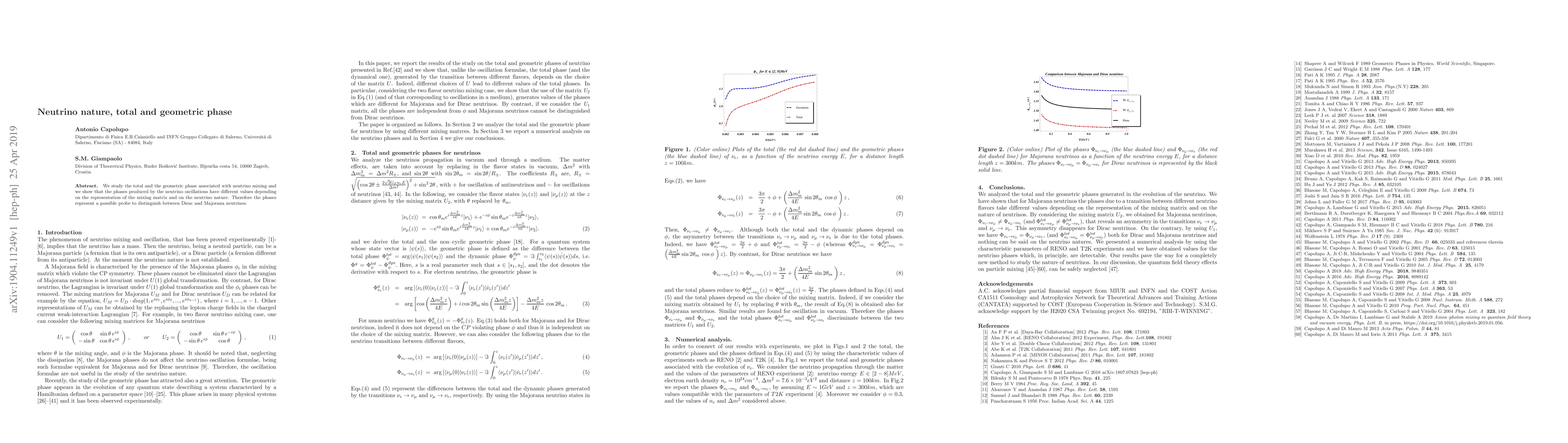 We study the total and the geometric phase associated with neutrino mixing and we show that the phases produced by the neutrino oscillations have different values depending on the representation of the mixing matrix and on the neutrino nature. Therefore the phases represent a possible probe to distinguish between Dirac and Majorana neutrinos.