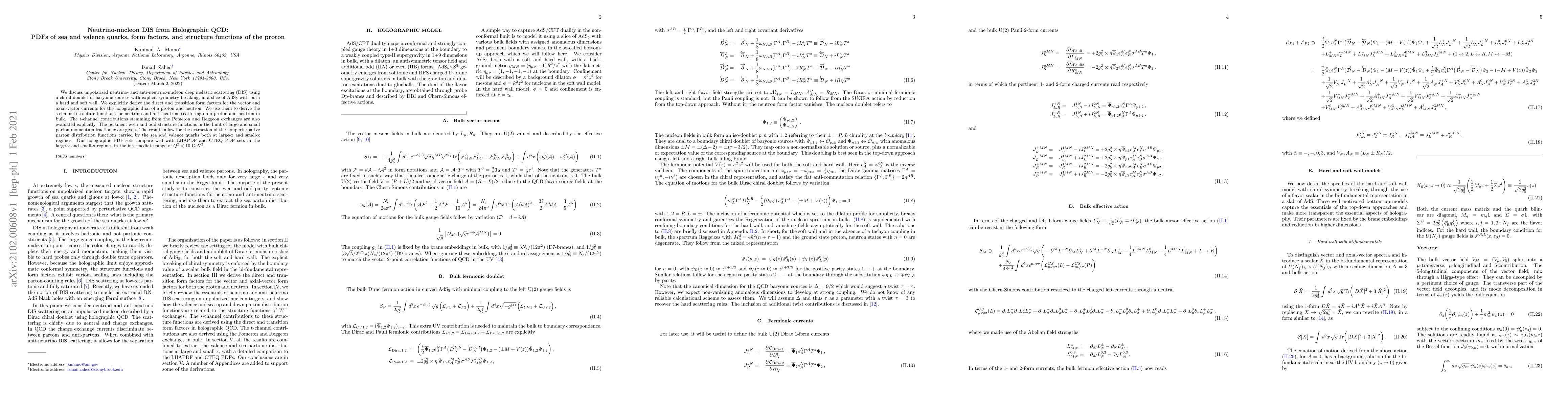 We discuss unpolarized neutrino- and anti-neutrino-nucleon deep inelastic scattering (DIS) using a chiral doublet of baryonic sources with explicit symmetry breaking, in a slice of AdS$_5$ with both a hard and soft wall. We explicitly derive the direct and transition form factors for the vector and axial-vector currents for the holographic dual of a proton and neutron. We use them to derive the s-channel structure functions for neutrino and anti-neutrino scattering on a proton and neutron in bulk. The t-channel contributions stemming from the Pomeron and Reggeon exchanges are also evaluated explicitly. The pertinent even and odd structure functions in the limit of large and small parton momentum fraction $x$ are given. The results allow for the extraction of the nonperterbative parton distribution functions carried by the sea and valence quarks both at large-x and small-x regimes. Our holographic PDF sets compare well with LHAPDF and CTEQ PDF sets in the large-x and small-x regimes in the intermediate range of $Q^2<10~\rm{GeV^2}$.