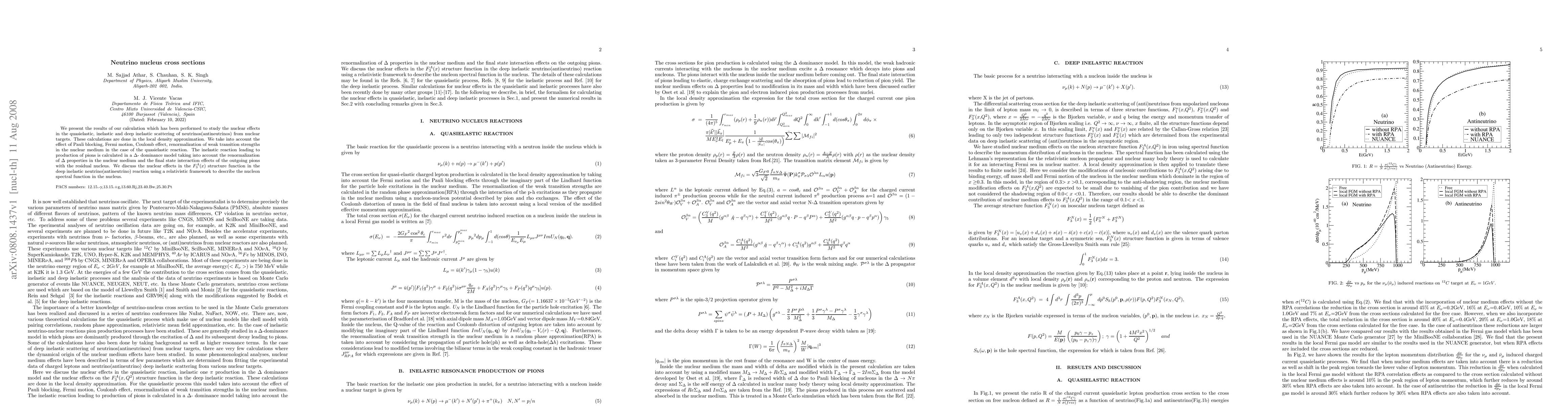 This research calculates nuclear effects in neutrino-nucleus interactions, including quasielastic, inelastic, and deep inelastic scattering. It considers Pauli blocking, Fermi motion, Coulomb effect, and medium renormalization of weak and Delta properties, providing insights into neutrino-nuclear physics.
