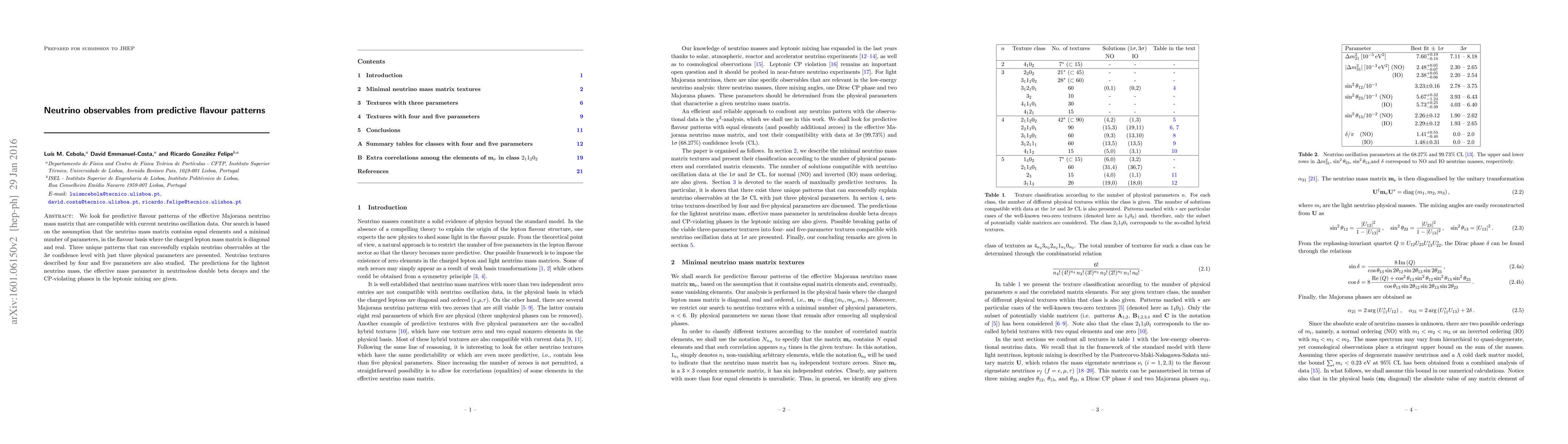 We look for predictive flavour patterns of the effective Majorana neutrino mass matrix that are compatible with current neutrino oscillation data. Our search is based on the assumption that the neutrino mass matrix contains equal elements and a minimal number of parameters, in the flavour basis where the charged lepton mass matrix is diagonal and real. Three unique patterns that can successfully explain neutrino observables at the $3\sigma$ confidence level with just three physical parameters are presented. Neutrino textures described by four and five parameters are also studied. The predictions for the lightest neutrino mass, the effective mass parameter in neutrinoless double beta decays and the CP-violating phases in the leptonic mixing are given.