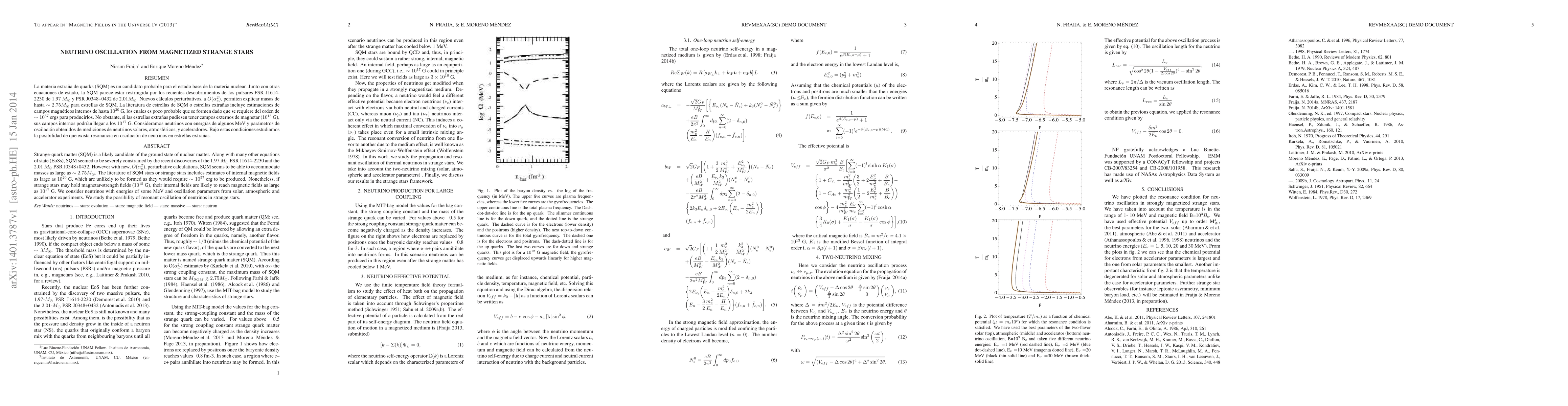 Strange-quark matter (SQM) is a likely candidate of the ground state of nuclear matter. Along with many other equations of state (EoSs), SQM seemed to be severely constrained by the recent discoveries of the 1.97 $M_\odot$ PSR J1614-2230 and the 2.01 $M_\odot$ PSR J0348+0432. However with new, $O(\alpha_c^2)$, perturbative calculations, SQM seems to be able to accommodate masses as large as $\sim 2.75 M_\odot$. The literature of SQM stars or strange stars includes estimates of internal magnetic fields as large as $10^{20}$ G, which are unlikely to be formed as they would require $\sim 10^{57}$ erg to be produced. Nonetheless, if strange stars may hold magnetar-strength fields ($10^{15}$ G), their internal fields are likely to reach magnetic fields as large as $10^{17}$ G. We consider neutrinos with energies of some MeV and oscillation parameters from solar, atmospheric and accelerator experiments. We study the possibility of resonant oscillation of neutrinos in strange stars.