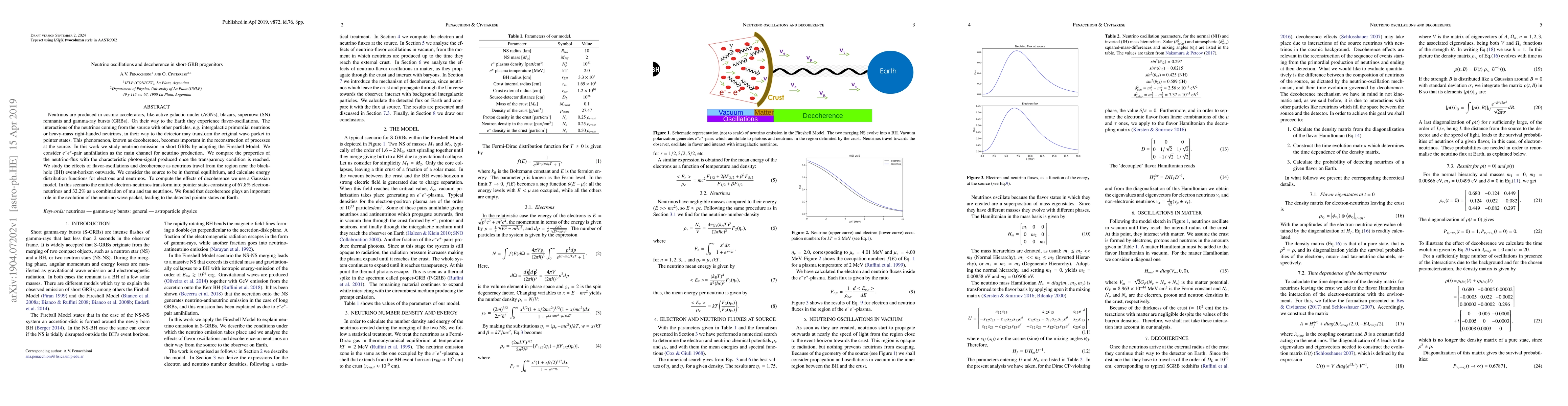 Neutrinos are produced in cosmic accelerators, like active galactic nuclei (AGNs), blazars, supernova (SN) remnants and gamma-ray bursts (GRBs). On their way to the Earth they experience flavor-oscillations. The interactions of the neutrinos coming from the source with other particles, e.g. intergalactic primordial neutrinos or heavy-mass right-handed neutrinos, in their way to the detector may transform the original wave packet in pointer states. This phenomenon, known as decoherence, becomes important in the reconstruction of processes at the source. In this work we study neutrino emission in short GRBs by adopting the Fireshell Model. We consider $e^{-}e^{+}$-pair annihilation as the main channel for neutrino production. We compare the properties of the neutrino-flux with the characteristic photon-signal produced once the transparency condition is reached. We study the effects of flavor-oscillations and decoherence as neutrinos travel from the region near the black-hole (BH) event-horizon outwards. We consider the source to be in thermal equilibrium, and calculate energy distribution functions for electrons and neutrinos. To compute the effects of decoherence we use a Gaussian model. In this scenario the emitted electron-neutrinos transform into pointer states consisting of $67.8\%$ electron-neutrinos and $32.2\%$ as a combination of mu and tau neutrinos. We found that decoherence plays an important role in the evolution of the neutrino wave packet, leading to the detected pointer states on Earth.