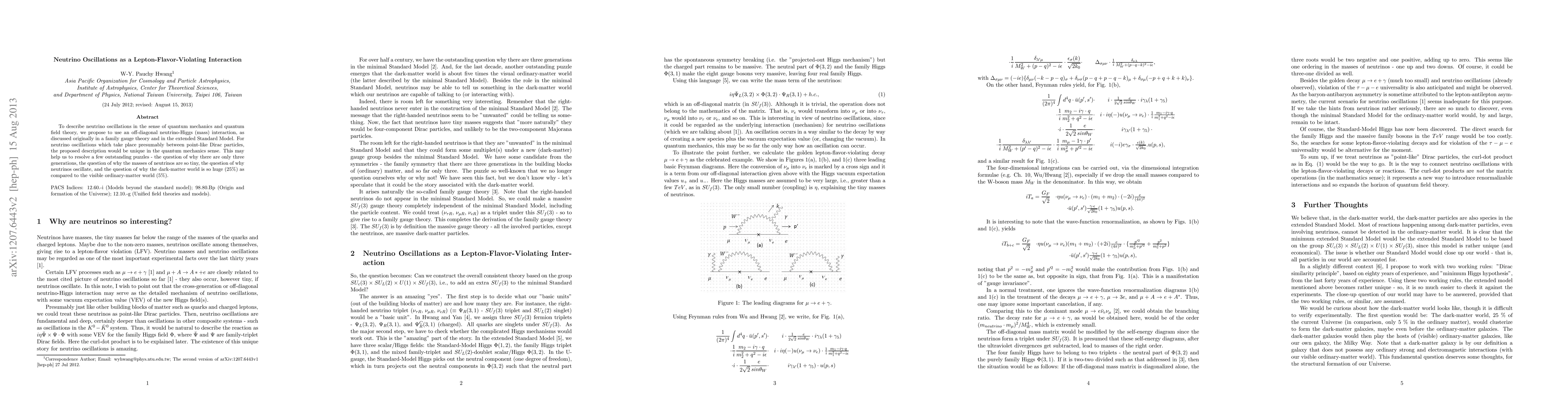 To describe neutrino oscillations in the sense of quantum mechanics and quantum field theory, we propose to use an off-diagonal neutrino-Higgs (mass) interaction, as discussed originally in a family gauge theory and in the extended Standard Model. For neutrino oscillations which take place presumably between point-like Dirac particles, the proposed description would be unique in the quantum mechanics sense. This may help us to resolve a few outstanding puzzles - the question of why there are only three generations, the question of why the masses of neutrinos are so tiny, the question of why neutrinos oscillate, and the question of why the dark-matter world is so huge (25%) as compared to the visible ordinary-matter world (5%).