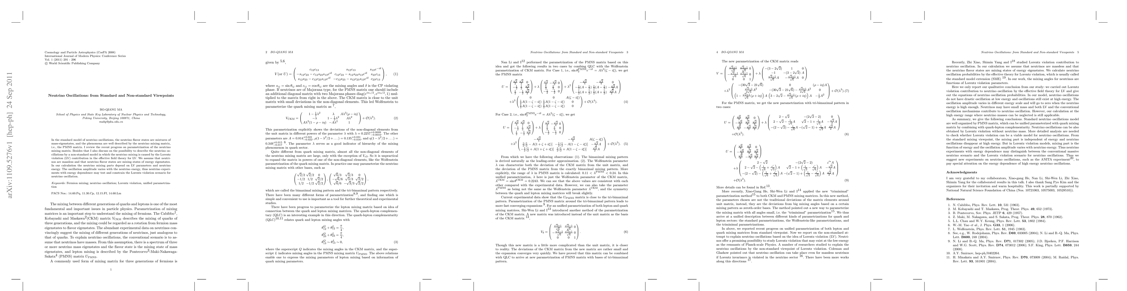 In the standard model of neutrino oscillations, the neutrino flavor states are mixtures of mass-eigenstates, and the phenomena are well described by the neutrino mixing matrix, i.e., the PMNS matrix. I review the recent progress on parametrization of the neutrino mixing matrix. Besides that I also discuss on the possibility to describe the neutrino oscillations by a non-standard model in which the neutrino mixing is caused by the Lorentz violation (LV) contribution in the effective field theory for LV. We assume that neutrinos are massless and that neutrino flavor states are mixing states of energy eigenstates. In our calculation the neutrino mixing parts depend on LV parameters and neutrino energy. The oscillation amplitude varies with the neutrino energy, thus neutrino experiments with energy dependence may test and constrain the Lorentz violation scenario for neutrino oscillation.
