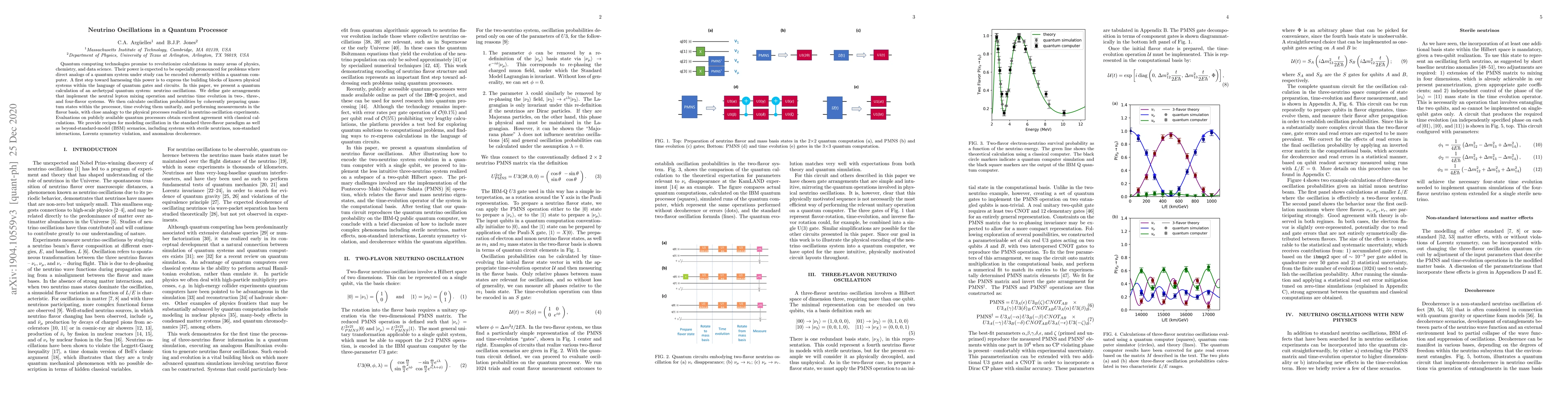 This paper explores the application of quantum computing to simulate neutrino oscillations, defining quantum gate arrangements to model neutral lepton mixing and time evolution in various flavor systems. It demonstrates excellent agreement between quantum processor calculations and classical results, providing models for both standard and extended neutrino oscillation scenarios.