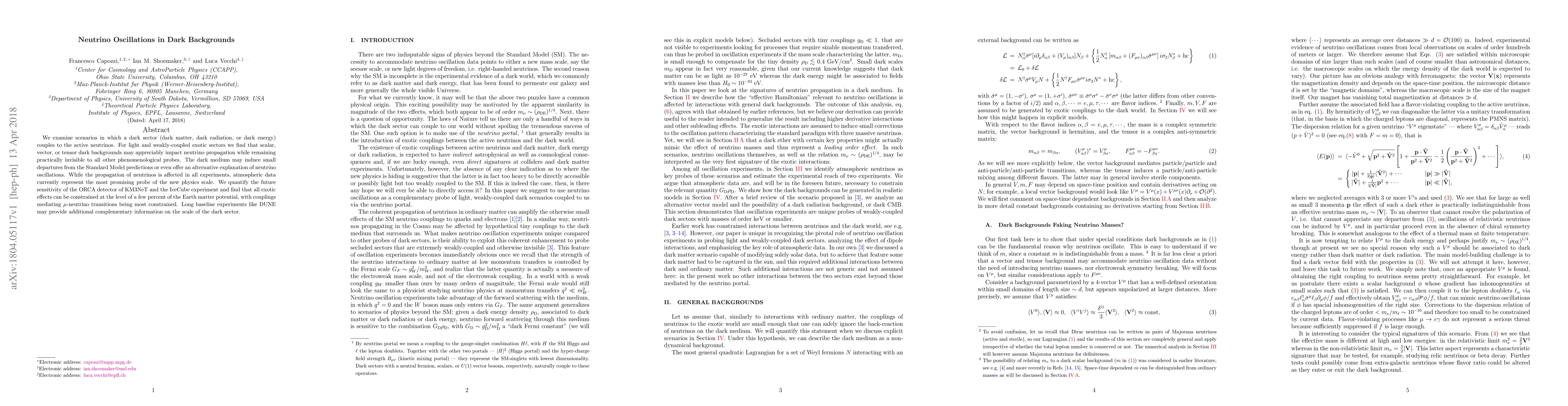 We examine scenarios in which a dark sector (dark matter, dark radiation, or dark energy) couples to the active neutrinos. For light and weakly-coupled exotic sectors we find that scalar, vector, or tensor dark backgrounds may appreciably impact neutrino propagation while remaining practically invisible to all other phenomenological probes. The dark medium may induce small departures from the Standard Model predictions or even offer an alternative explanation of neutrino oscillations. While the propagation of neutrinos is affected in all experiments, atmospheric data currently represent the most promising probe of the new physics scale. We quantify the future sensitivity of the ORCA detector of KM3NeT and the IceCube experiment and find that all exotic effects can be constrained at the level of a few percent of the Earth matter potential, with couplings mediating $\mu$-neutrino transitions being most constrained. Long baseline experiments like DUNE may provide additional complementary information on the scale of the dark sector.