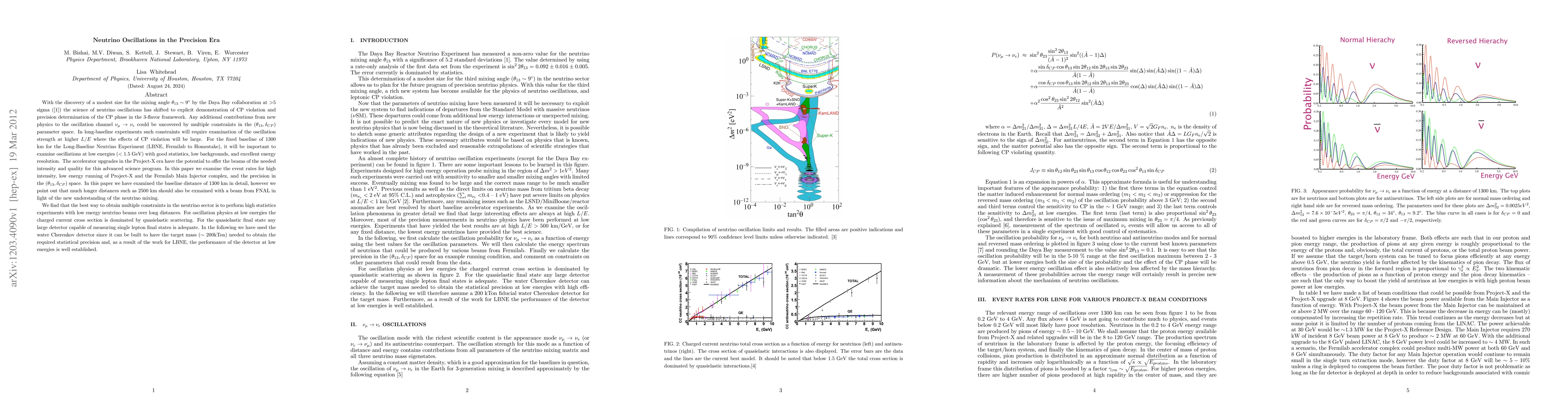 With the discovery of a modest size for the mixing angle $\theta_{13} \sim 9^\circ$ by the Daya Bay collaboration at $>$5 sigma (\cite{dayabay}) the science of neutrino oscillations has shifted to explicit demonstration of CP violation and precision determination of the CP phase in the 3-flavor framework. Any additional contributions from new physics to the oscillation channel $\nu_\mu \to \nu_e$ could be uncovered by multiple constraints in the ($\theta_{13}, \delta_{CP}$) parameter space. In long-baseline experiments such constraints will require examination of the oscillation strength at higher $L/E$ where the effects of CP violation will be large. For the fixed baseline of 1300 km for the Long-Baseline Neutrino Experiment (LBNE, Fermilab to Homestake), it will be important to examine oscillations at low energies ($<1.5$ GeV) with good statistics, low backgrounds, and excellent energy resolution. The accelerator upgrades in the Project-X era have the potential to offer the beams of the needed intensity and quality for this advanced science program. In this paper we examine the event rates for high intensity, low energy running of Project-X and the Fermilab Main Injector complex, and the precision in the ($\theta_{13}, \delta_{CP}$) space. In this paper we have examined the baseline distance of 1300 km in detail, however we point out that much longer distances such as 2500 km should also be exmained with a beam from FNAL in light of the new understanding of the neutrino mixing.