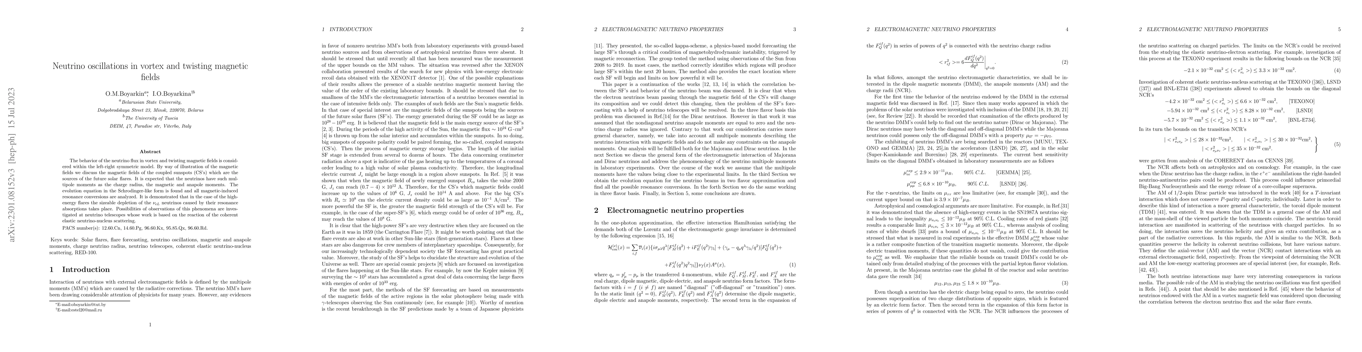 The behavior of the neutrino flux in vortex and twisting magnetic fields is considered within the left-right symmetric model. By way of illustration of the magnetic fields we discuss the magnetic fields of the coupled sunspots (CS's) which are the sources of the future solar flares. It is expected that the neutrinos have such multipole moments as the charge radius, the magnetic and anapole moments. The evolution equation in the Schrodinger-like form is found and all magnetic-induced resonance conversions are analyzed. It is demonstrated that in the case of the high-energy flares the sizeable depletion of the $\nu_{eL}$ neutrinos caused by their resonance absorptions takes place. Possibilities of observations of this phenomena are investigated at neutrino telescopes whose work is based on the reaction of the coherent elastic neutrino-nucleus scattering.