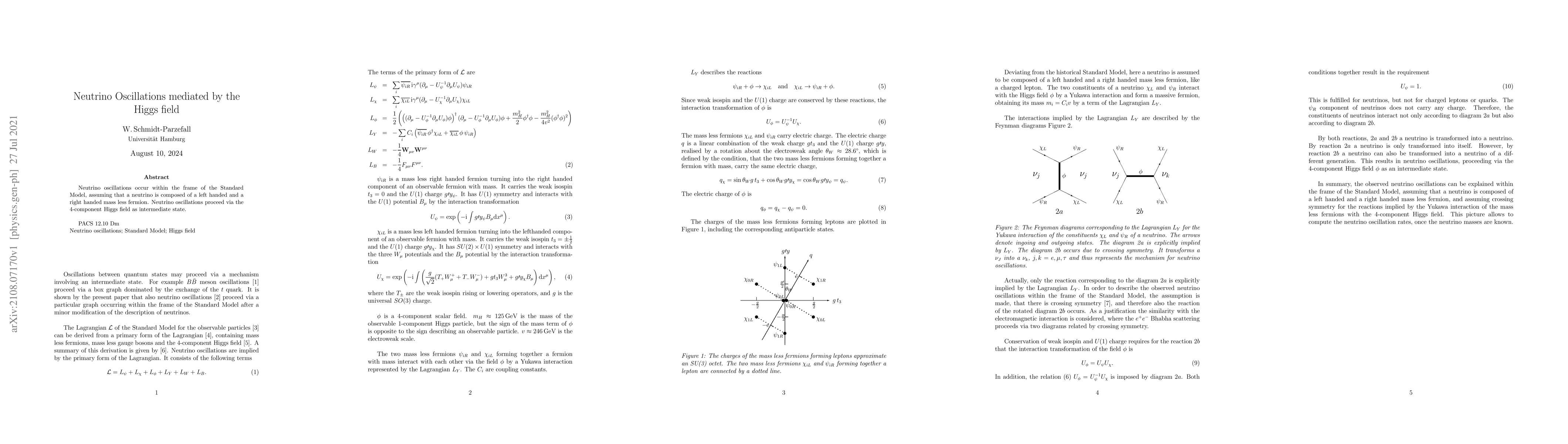Neutrino oscillations occur within the frame of the Standard Model, assuming that a neutrino is composed of a left handed and a right handed mass less fermion. Neutrino oscillations proceed via the 4-component Higgs field as intermediate state.