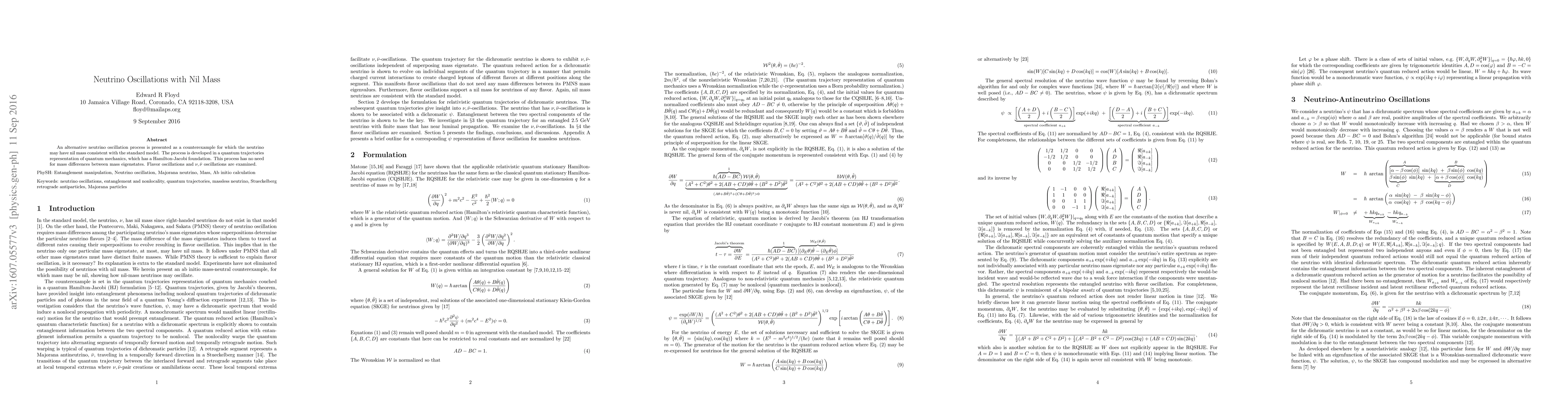 This paper proposes an alternative neutrino oscillation mechanism that allows for nil mass neutrinos, challenging conventional mass-based models. Utilizing a quantum trajectories framework with a Hamilton-Jacobi foundation, it explores flavor and antineutrino oscillations without requiring mass differences.