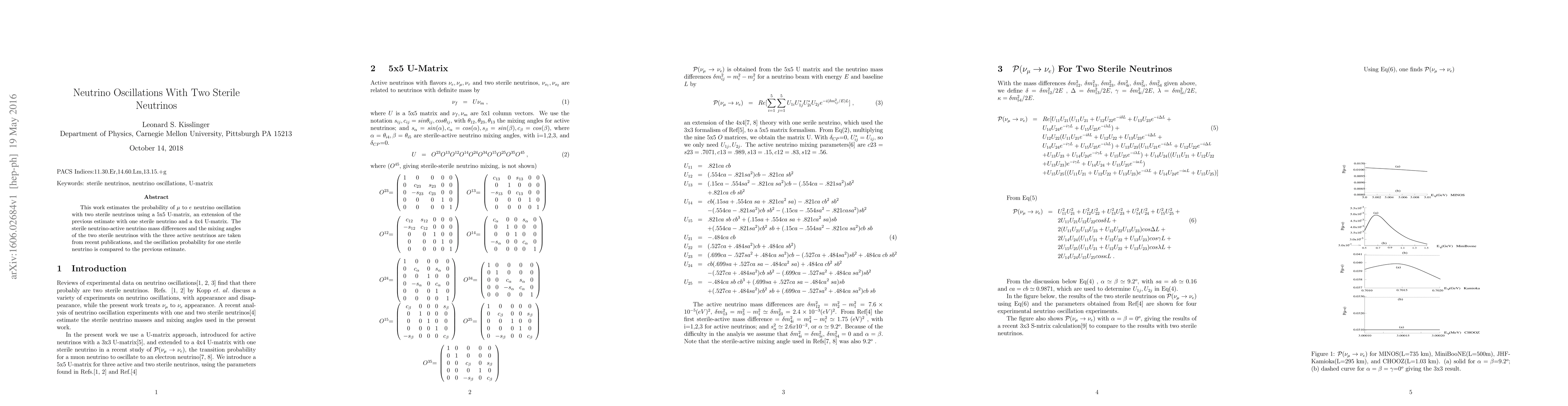 This work estimates the probability of $\mu$ to $e$ neutrino oscillation with two sterile neutrinos using a 5x5 U-matrix, an extension of the previous estimate with one sterile neutrino and a 4x4 U-matrix. The sterile neutrino-active neutrino mass differences and the mixing angles of the two sterile neutrinos with the three active neutrinos are taken from recent publications, and the oscillation probability for one sterile neutrino is compared to the previous estimate.