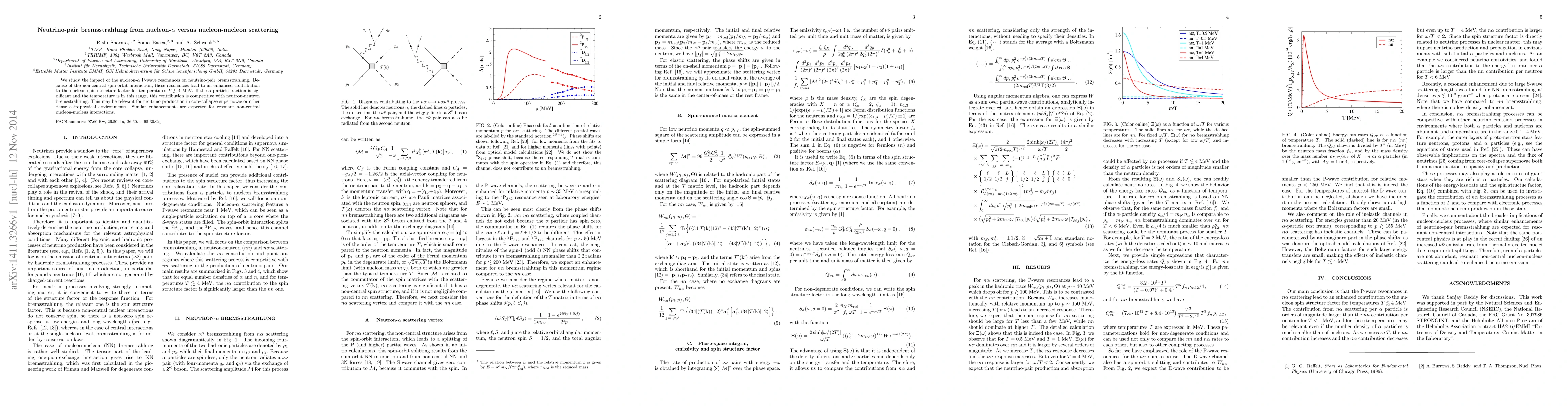 This paper investigates how nucleon-$\alpha$ P-wave resonances affect neutrino-pair bremsstrahlung, finding that these resonances significantly enhance the nucleon spin structure factor at low temperatures. This effect could rival neutrino production from neutron-neutron interactions in dense astrophysical environments like core-collapse supernovae.