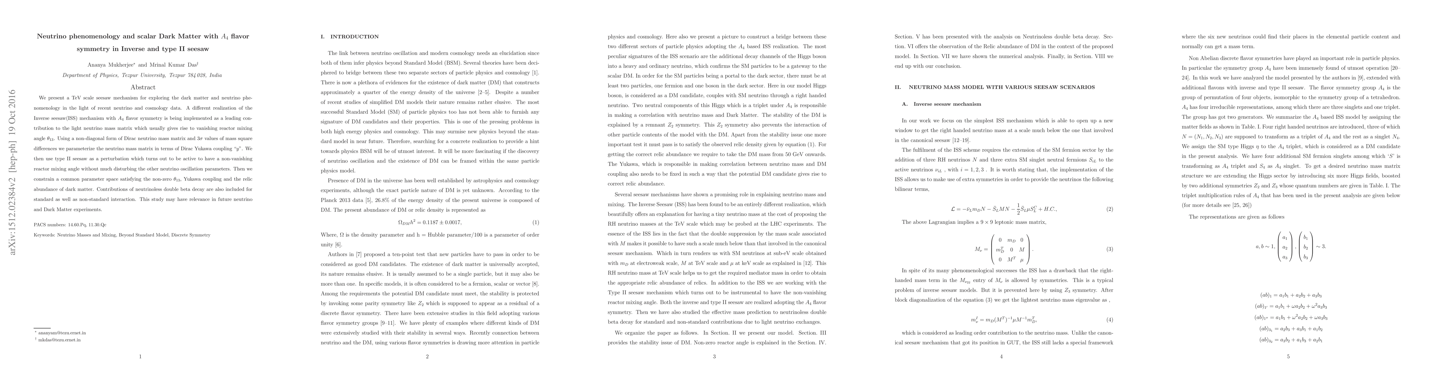This paper explores a TeV scale seesaw mechanism incorporating $A_{4}$ flavor symmetry to study neutrino phenomenology and scalar Dark Matter, using the Inverse seesaw to achieve a non-zero reactor mixing angle $\theta_{13}$ while perturbing with type II seesaw. It constrains parameters to fit observed neutrino oscillation data and Dark Matter relic abundance.