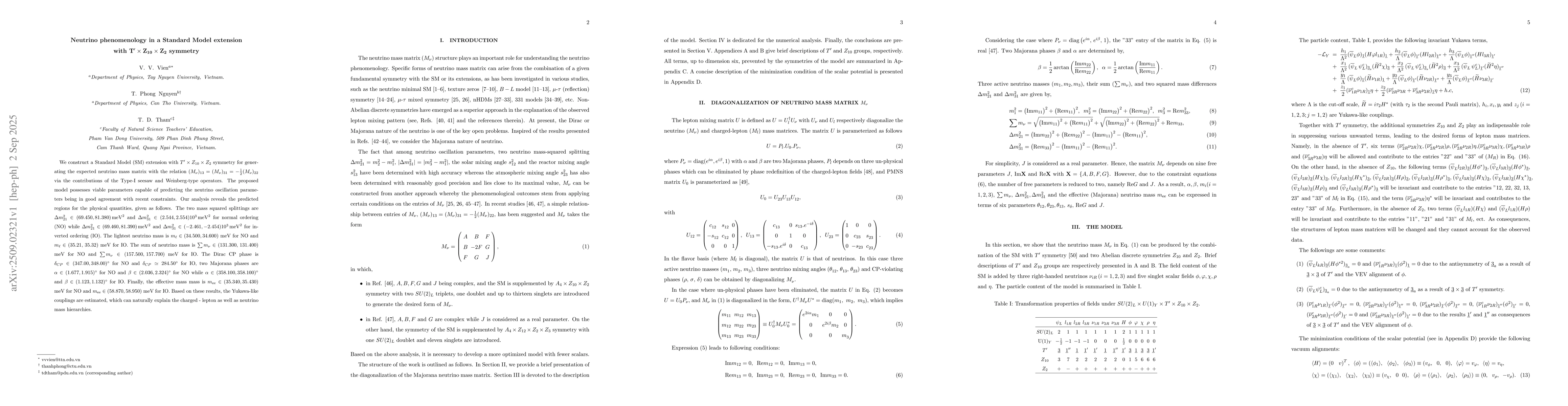 We construct a Standard Model (SM) extension with $T^\prime\times Z_{10} \times Z_2$ symmetry for generating the expected neutrino mass matrix with the relation $(M_\nu)_{13}=(M_\nu)_{31}=-\frac{1}{2}(M_\nu)_{22}$ via the contributions of the Type-I seesaw and Weinberg-type operators. The proposed model possesses viable parameters capable of predicting the neutrino oscillation parameters being in good agreement with recent constraints. Our analysis reveals the predicted regions for the physical quantities, given as follows. The two mass squared splittings are $\Delta m_{21}^2\in (69.450, 81.380)\, \mathrm{meV}^2$ and $\Delta m_{31}^2\in (2.544, 2.554)10^3\,\mathrm{meV}^2$ for normal ordering (NO) while $\Delta m_{21}^2\in (69.460, 81.390)\, \mathrm{meV}^2$ and $\Delta m_{31}^2\in (-2.461, -2.454)10^3\,\mathrm{meV}^2$ for inverted ordering (IO). The lightest neutrino mass is $m_{\ell}\in (34.500, 34.600)$ meV for NO and $m_{\ell}\in(35.21,\, 35.32)$ meV for IO. The sum of neutrino mass is $\sum m_\nu \in (131.300,\, 131.400)$ meV for NO and $\sum m_\nu \in (157.500,\, 157.700)$ meV for IO. The Dirac CP phase is $\delta_{CP}\in (347.00, 348.00)^\circ$ for NO and $\delta_{CP}\simeq 284.50^\circ$ for IO, two Majorana phases are $\alpha\in (1.677, 1.915)^\circ$ for NO and $\beta\in (2.036, 2.324)^\circ$ for NO while $\alpha\in (358.100, 358.100)^\circ$ and $\beta\in (1.123, 1.132)^\circ$ for IO. Finally, the effective mass mass is $m_{\mathrm{ee}}\in (35.340, 35.430)$ meV for NO and $m_{\mathrm{ee}}\in (58.870, 58.950)$ meV for IO. Based on these results, the Yukawa-like couplings are estimated, which can naturally explain the charged - lepton as well as neutrino mass hierarchies.
