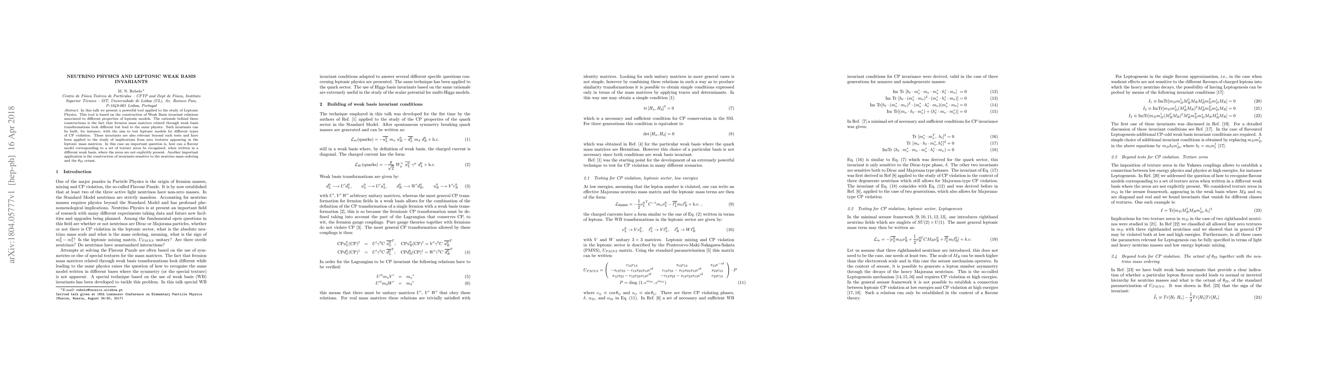 In this talk we present a powerful tool applied to the study of Leptonic Physics. This tool is based on the construction of Weak Basis invariant relations associated to different properties of leptonic models. The rationale behind these constructions is the fact that fermion mass matrices related through weak basis transformations look different but lead to the same physics. Such invariants can be built, for instance, with the aim to test leptonic models for different types of CP violation. These invariants are also relevant beyond such tests and have been applied to the study of implications from zero textures appearing in the leptonic mass matrices. In this case an important question is, how can a flavour model corresponding to a set of texture zeros be recognised, when written in a different weak basis, where the zeros are not explicitly present. Another important application is the construction of invariants sensitive to the neutrino mass ordering and the $\theta_{23}$ octant.