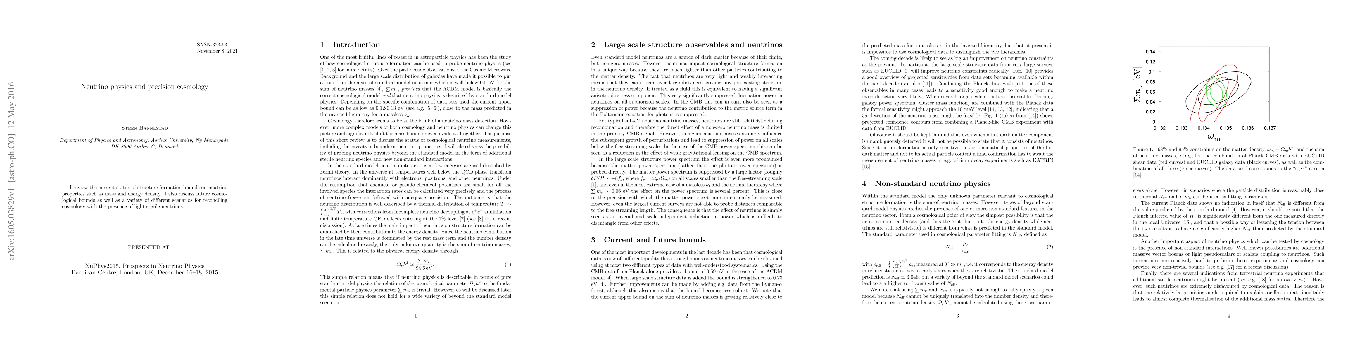 I review the current status of structure formation bounds on neutrino properties such as mass and energy density. I also discuss future cosmological bounds as well as a variety of different scenarios for reconciling cosmology with the presence of light sterile neutrinos.