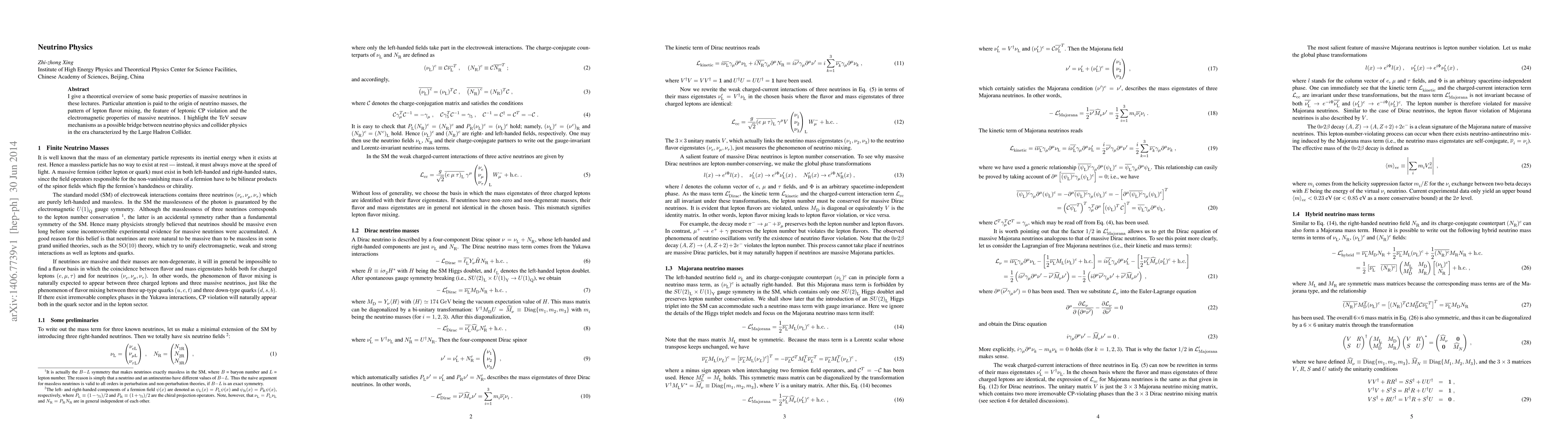 I give a theoretical overview of some basic properties of massive neutrinos in these lectures. Particular attention is paid to the origin of neutrino masses, the pattern of lepton flavor mixing, the feature of leptonic CP violation and the electromagnetic properties of massive neutrinos. I highlight the TeV seesaw mechanisms as a possible bridge between neutrino physics and collider physics in the era characterized by the Large Hadron Collider.