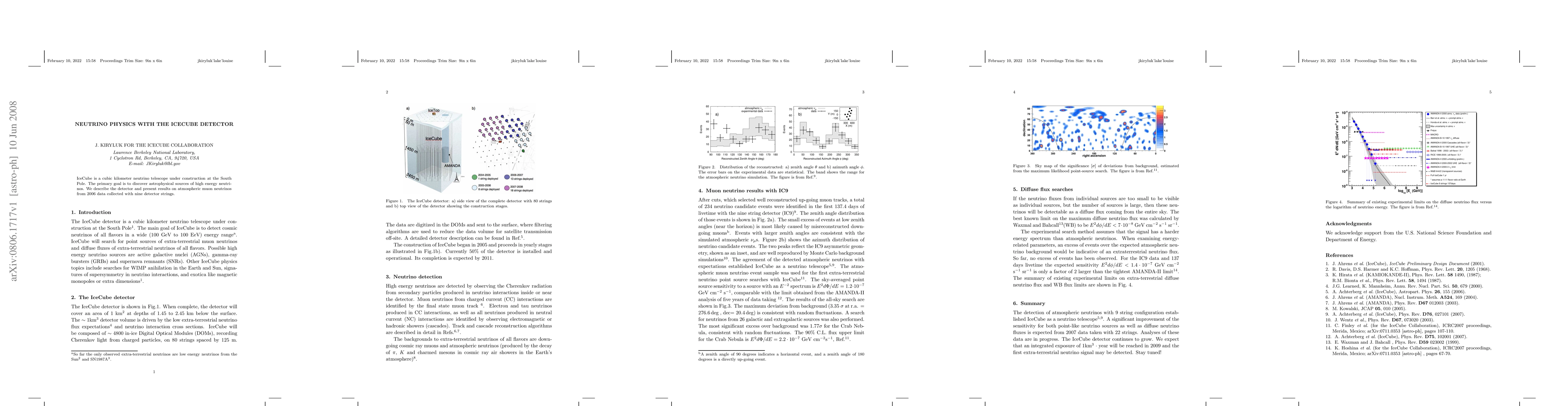 Summary: The IceCube detector, a cubic kilometer neutrino telescope at the South Pole, aims to identify high-energy astrophysical neutrino sources. Initial results from 2006 data show observations of atmospheric muon neutrinos using nine detector strings.