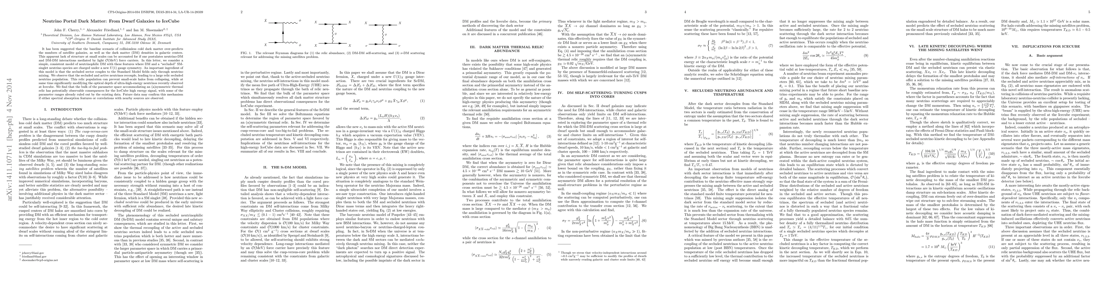 This paper proposes a neutrino portal dark matter model where interactions mediated by light force carriers can resolve discrepancies in satellite galaxies and dark matter densities at small scales. It suggests that a secluded neutrino species, coupled to the Standard Model via neutrino mixing, can modify ultra-high-energy neutrino signals observed at IceCube, potentially offering observable consequences for future data.