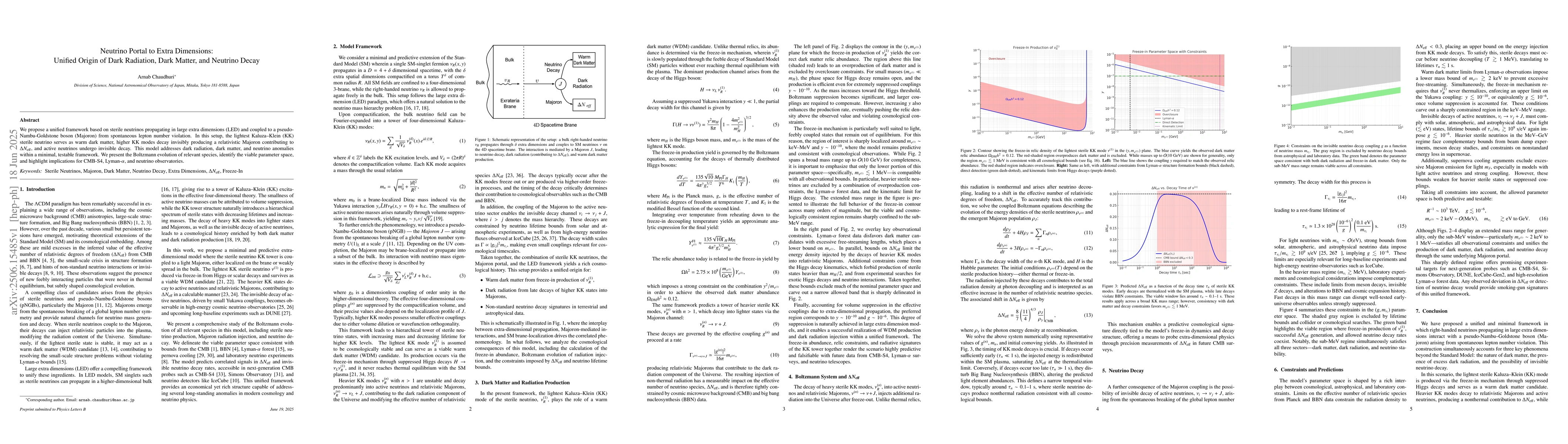 We propose a unified framework based on sterile neutrinos propagating in large extra dimensions (LED) and coupled to a pseudo-Nambu-Goldstone boson (Majoron) arising from spontaneous lepton number violation. In this setup, the lightest Kaluza-Klein (KK) sterile neutrino serves as warm dark matter, higher KK modes decay invisibly producing a relativistic Majoron contributing to the effective number of neutrino species (Delta Neff), and active neutrinos undergo invisible decay. This model addresses dark radiation, dark matter, and neutrino anomalies within a minimal, testable framework. We present the Boltzmann evolution of relevant species, identify the viable parameter space, and highlight implications for CMB-S4, Lyman-alpha, and neutrino observatories.