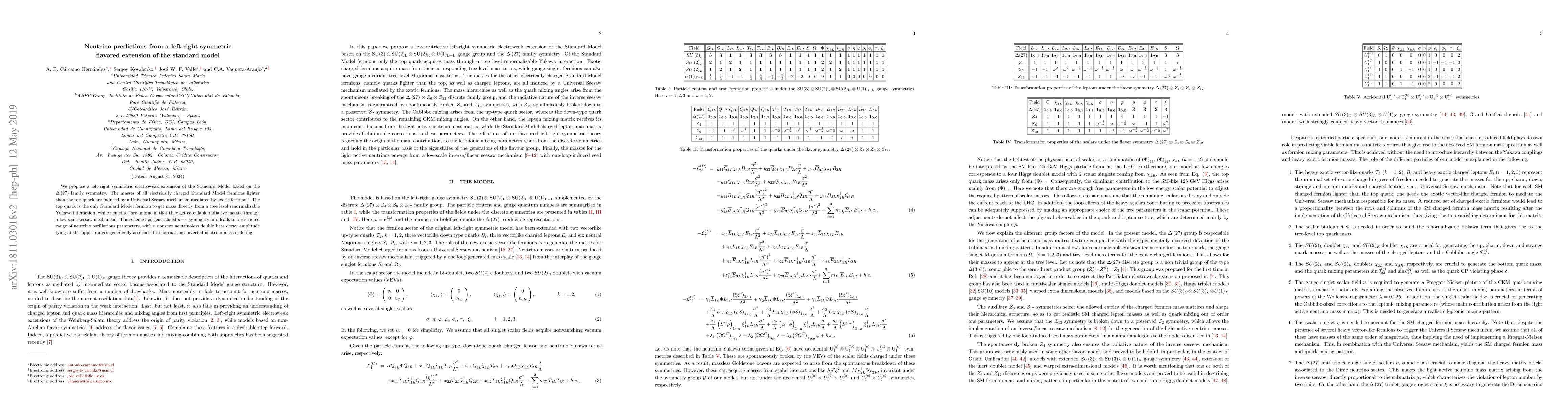 We propose a left-right symmetric electroweak extension of the Standard Model based on the $\Delta \left( 27\right)$ family symmetry. The masses of all electrically charged Standard Model fermions lighter than the top quark are induced by a Universal Seesaw mechanism mediated by exotic fermions. The top quark is the only Standard Model fermion to get mass directly from a tree level renormalizable Yukawa interaction, while neutrinos are unique in that they get calculable radiative masses through a low-scale seesaw mechanism. The scheme has generalized $\mu-\tau$ symmetry and leads to a restricted range of neutrino oscillations parameters, with a nonzero neutrinoless double beta decay amplitude lying at the upper ranges generically associated to normal and inverted neutrino mass ordering.
