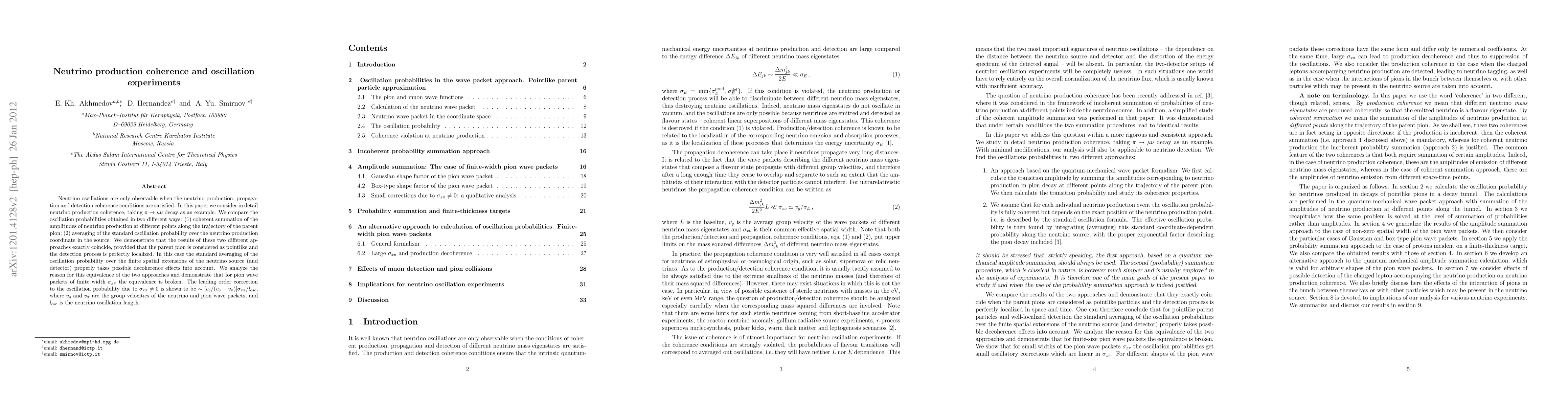 This paper explores neutrino production coherence in oscillation experiments, specifically using the decay of pions to muon neutrinos. It demonstrates that coherent summation of production amplitudes and averaging over the source's spatial extent yield identical oscillation probabilities, provided the pion is pointlike and detection is precise. However, for finite pion width, the equivalence breaks down, introducing a correction proportional to the pion's spatial extent relative to the oscillation length.