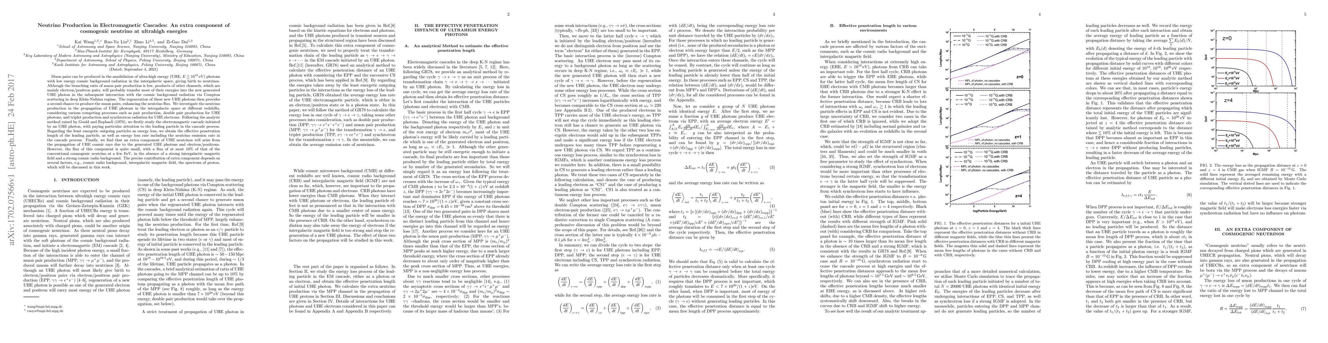 Muon pairs can be produced in the annihilation of ultra-high energy (UHE, $E \gtrsim 10^{18} \,\mathrm{eV}$) photons with low energy cosmic background radiation in the intergalactic space, giving birth to neutrinos. Although the branching ratio of muon pair production is low, products of other channels, which are mainly electron/positron pairs, will probably transfer most of their energies into the new generated UHE photon in the subsequent interaction with the cosmic background radiation via Compton scattering in deep Klein-Nishina regime. The regeneration of these new UHE photons then provides a second chance to produce the muon pairs, enhancing the neutrino flux. We investigate the neutrino production in the propagation of UHE photons in the intergalactic space at different redshifts, considering various competing processes such as pair production, double pair production for UHE photons, and triplet production and synchrotron radiation for UHE electrons. Regarding the least energetic outgoing particles as energy loss, we obtain the effective penetration length of the leading particle, as well as energy loss rate including the neutrino emission rate in the cascade process. Finally, we find that an extra component of UHE neutrinos will arise from the propagation of UHE cosmic rays due to the generated UHE photons and electron/positrons. However, the flux of this component is quite small, with a flux of at most $10\%$ of that of the conventional cosmogenic neutrino at a few EeV, in the absence of a strong intergalactic magnetic field and a strong cosmic radio background. The precise contribution of extra component depends on several factors, e.g., cosmic radio background, intergalactic magnetic field, the spectrum of proton, which will be discussed in this work.