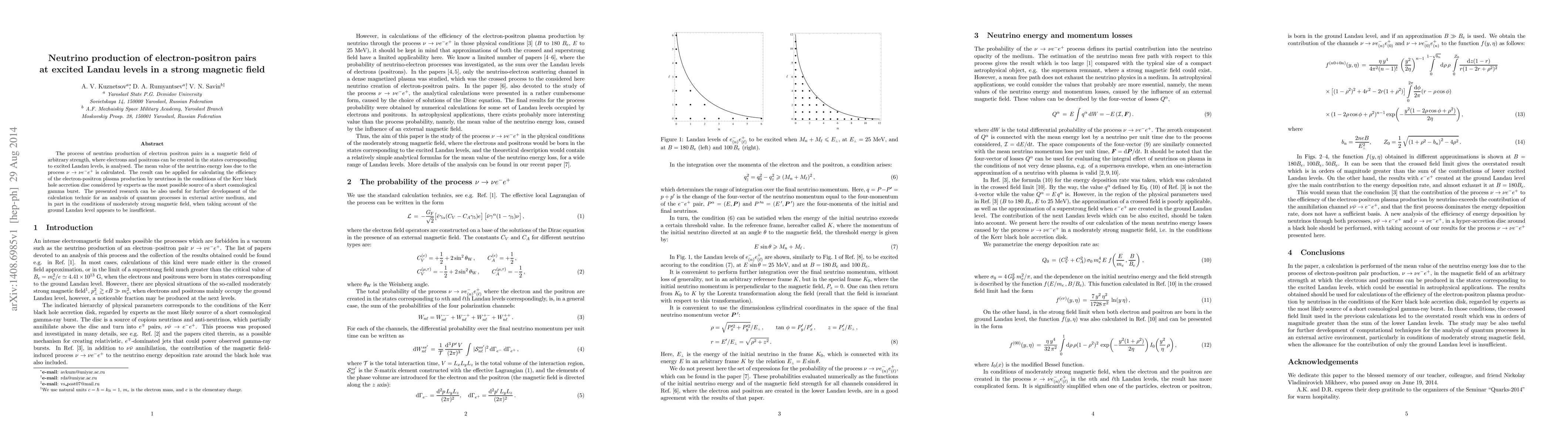 This paper analyzes neutrino production of electron-positron pairs in strong magnetic fields, considering excited Landau levels. It calculates the mean neutrino energy loss via the process $\nu \to \nu e^- e^+$, which is relevant for assessing electron-positron plasma production in Kerr black hole accretion discs and for advancing quantum process calculations in magnetic fields.