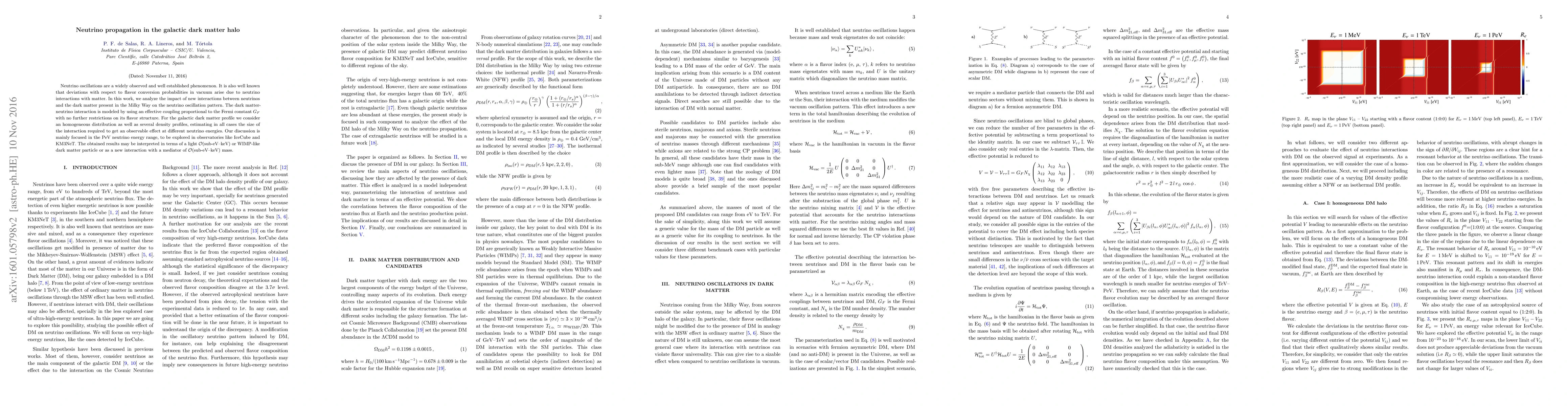 This paper investigates how interactions between neutrinos and dark matter in the Milky Way's halo affect neutrino oscillation patterns, particularly in the PeV energy range. It models these interactions using an effective coupling and explores various dark matter density profiles to determine the interaction size needed for observable effects.