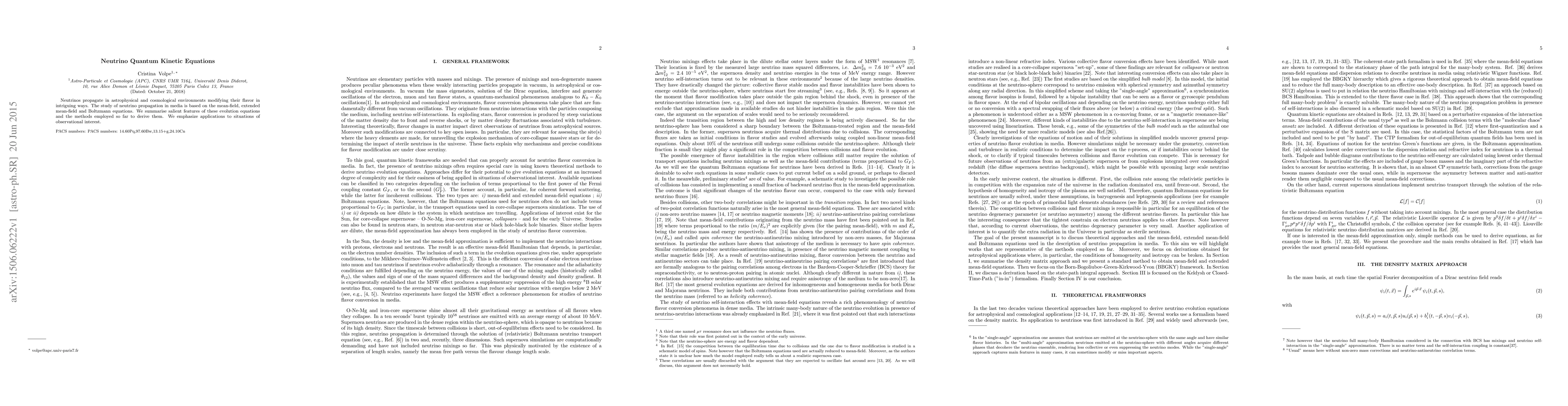 Neutrinos propagate in astrophysical and cosmological environments modifying their flavor in intriguing ways. The study of neutrino propagation in media is based on the mean-field, extended mean-field and Boltzmann equations. We summarise salient features of these evolution equations and the methods employed so far to derive them. We emphasize applications to situations of observational interest.