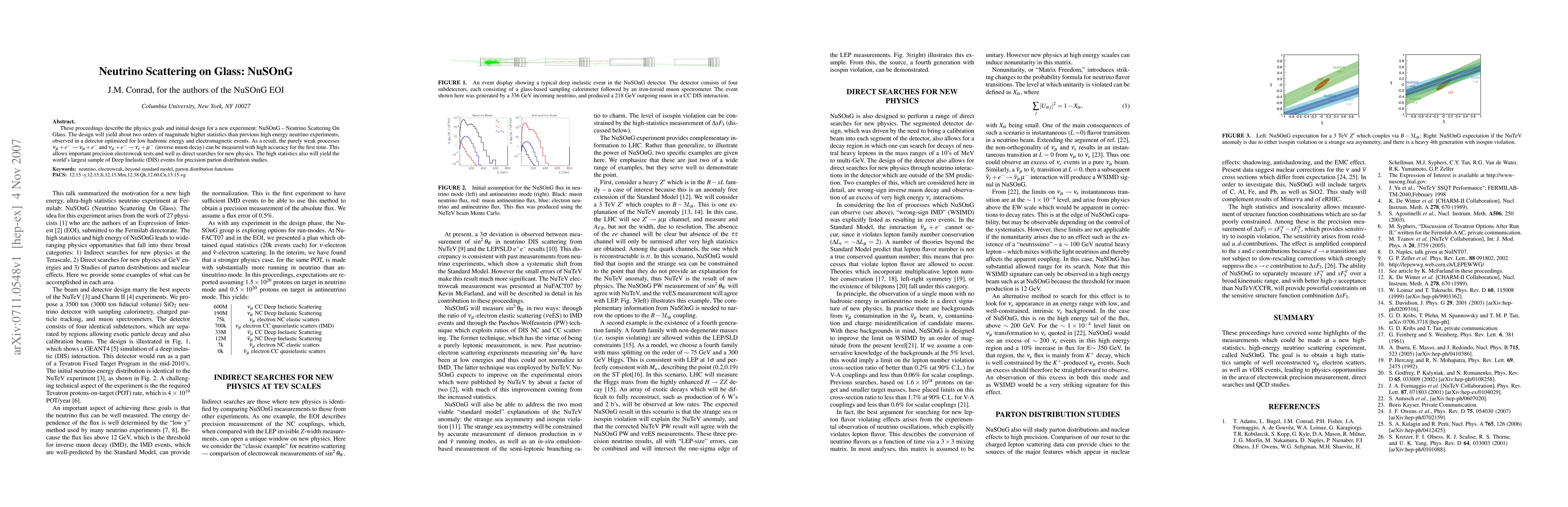 These proceedings describe the physics goals and initial design for a new experiment: NuSOnG -- Neutrino Scattering On Glass. The design will yield about two orders of magnitude higher statistics than previous high energy neutrino experiments, observed in a detector optimized for low hadronic energy and electromagnetic events. As a result, the purely weak processes $\nu_{\mu}+e^- \to \nu_{\mu}+ e^-$ and $\nu_{\mu}+ e^- \to \nu_e + \mu^-$ (inverse muon decay) can be measured with high accuracy for the first time. This allows important precision electroweak tests and well as direct searches for new physics. The high statistics also will yield the world's largest sample of Deep Inelastic (DIS) events for precision parton distribution studies.