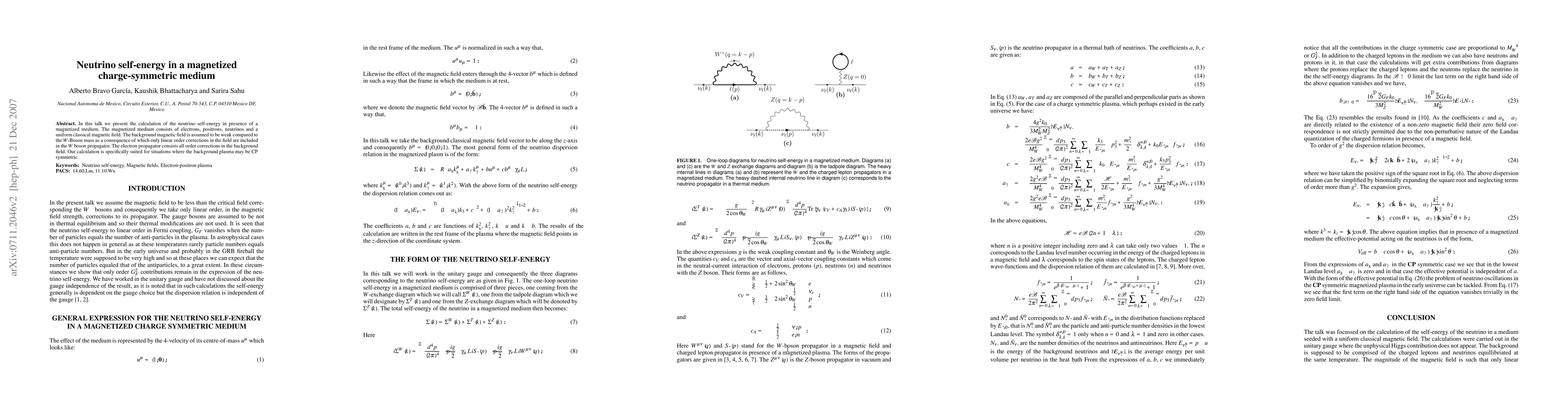 In this talk we present the calculation of the neutrino self-energy in presence of a magnetized medium. The magnetized medium consists of electrons, positrons, neutrinos and a uniform classical magnetic field. The background magnetic field is assumed to be weak compared to the $W$-Boson mass as a consequence of which only linear order corrections in the field are included in the $W$ boson propagator. The electron propagator consists all order corrections in the background field. Our calculation is specifically suited for situations where the background plasma may be CP symmetric.