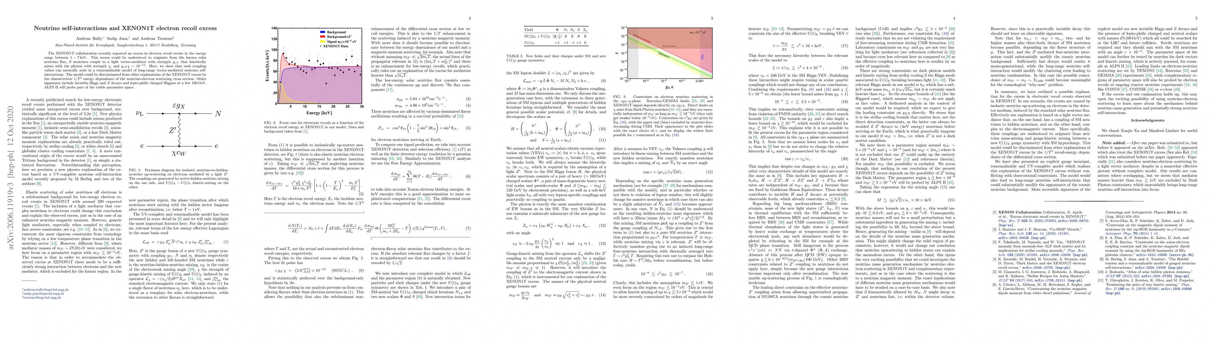 The XENON1T collaboration detected an excess in electron recoil events, potentially explained by neutrinos interacting via a light vector-mediator. This model predicts a $1/T^2$ energy dependence and additional signatures like invisible Higgs and Z decays, testable by ALPS II.