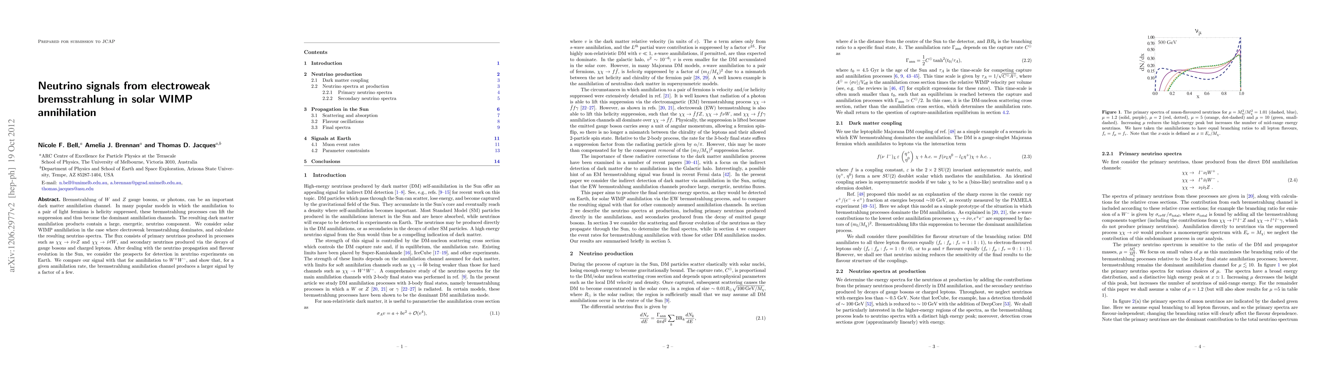 Bremsstrahlung of $W$ and $Z$ gauge bosons, or photons, can be an important dark matter annihilation channel. In many popular models in which the annihilation to a pair of light fermions is helicity suppressed, these bremsstrahlung processes can lift the suppression and thus become the dominant annihilation channels. The resulting dark matter annihilation products contain a large, energetic, neutrino component. We consider solar WIMP annihilation in the case where electroweak bremsstrahlung dominates, and calculate the resulting neutrino spectra. The flux consists of primary neutrinos produced in processes such as $\chi\chi\rightarrow \bar{\nu}\nu Z$ and $\chi\chi\rightarrow \bar{\nu}\ell W$, and secondary neutrinos produced via the decays of gauge bosons and charged leptons. After dealing with the neutrino propagation and flavour evolution in the Sun, we consider the prospects for detection in neutrino experiments on Earth. By comparing our signal with that for annihilation to $W^+W^-$, we show that the detection prospects for the bremsstrahlung annihilation channel are favourable.