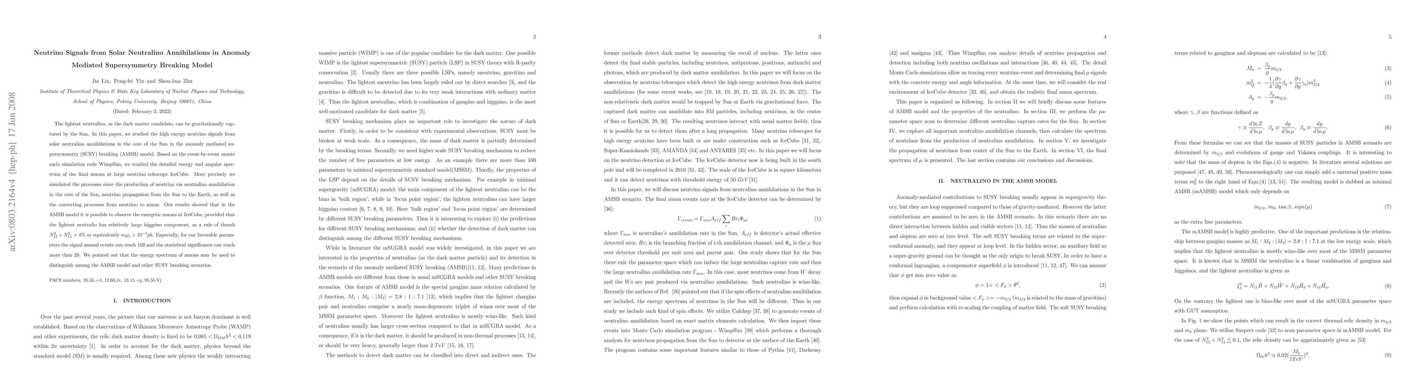 This paper investigates high-energy neutrino signals from solar neutralino annihilations in the anomaly mediated supersymmetry breaking (AMSB) model, using the WimpSim simulation. It finds that under certain conditions, IceCube could detect energetic muons, potentially distinguishing the AMSB model from other SUSY scenarios.